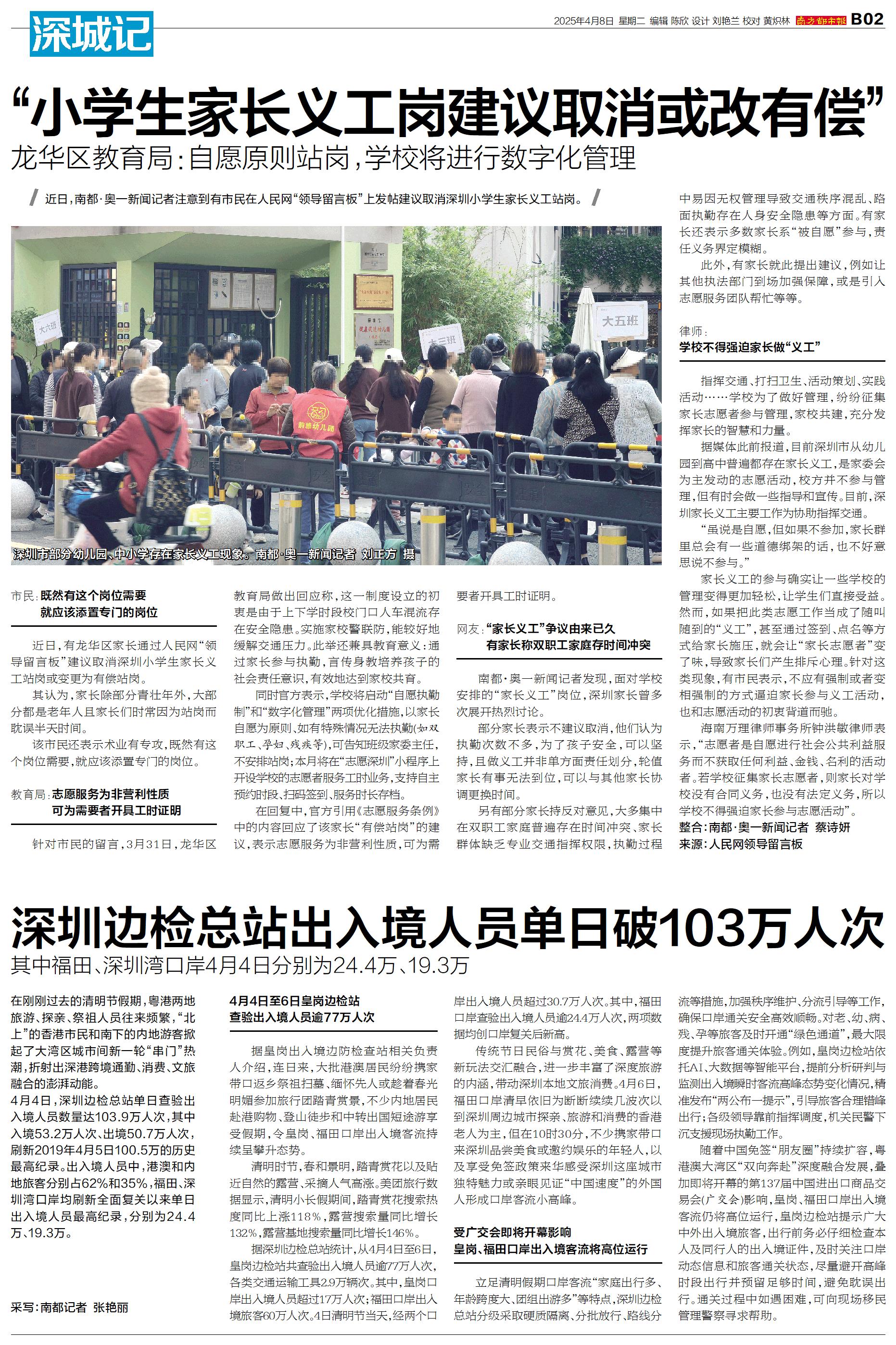 近日,南都·奥一新闻记者注意到有市民在人民网“领导留言板”上发帖建议取消深圳小学生家长义工站岗。 市民:既然有这个岗位需要 就应该添置专门的岗位 近日,有龙华区家长通过人民网“领导留言板