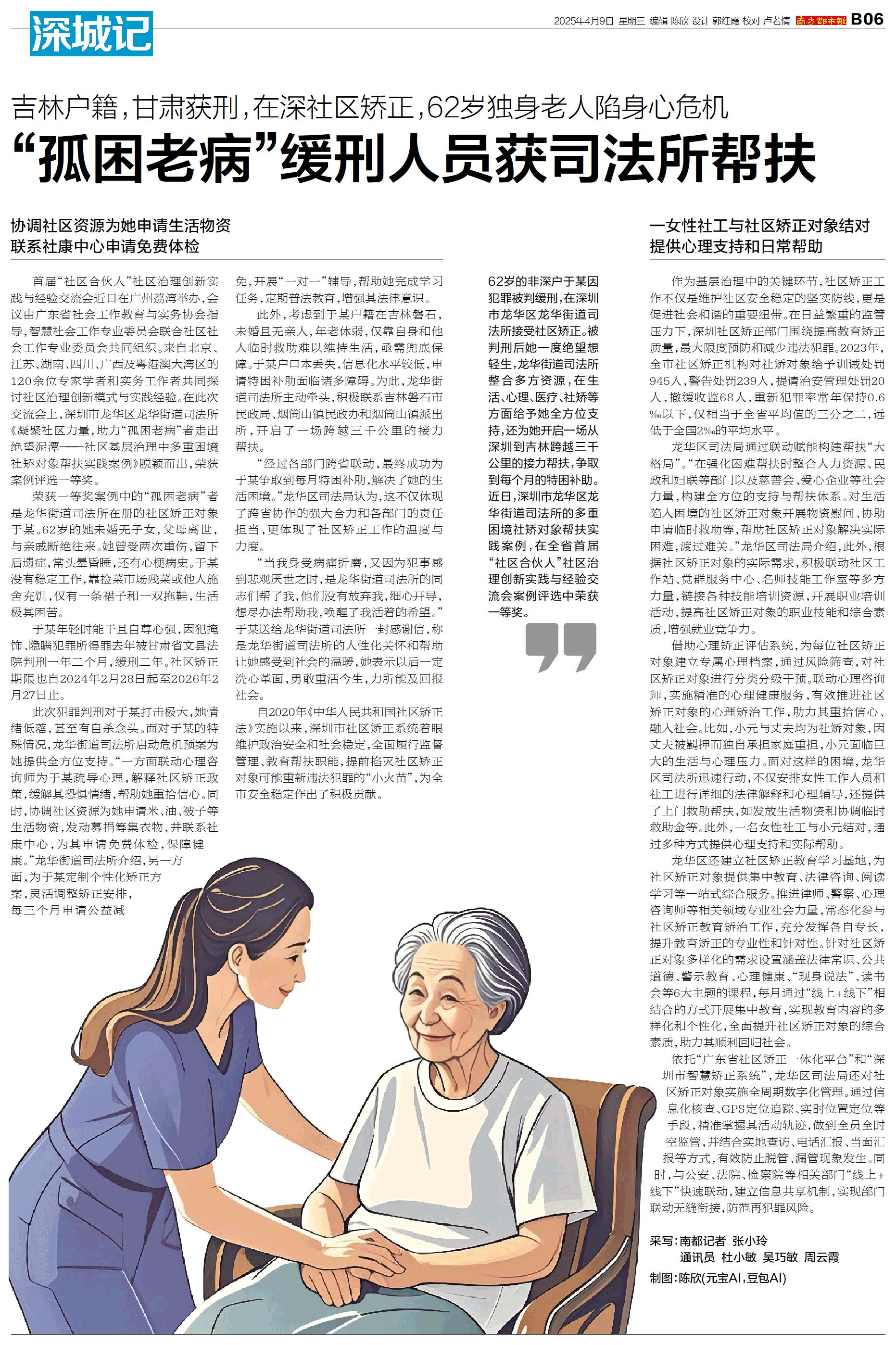 62岁的非深户于某因犯罪被判缓刑,在深圳市龙华区龙华街道司法所接受社区矫正。被判刑后她一度绝望想轻生,龙华街道司法所整合多方资源,在生活、心理、医疗、社矫等方面给予她全方位支持,还为她开启一场从深