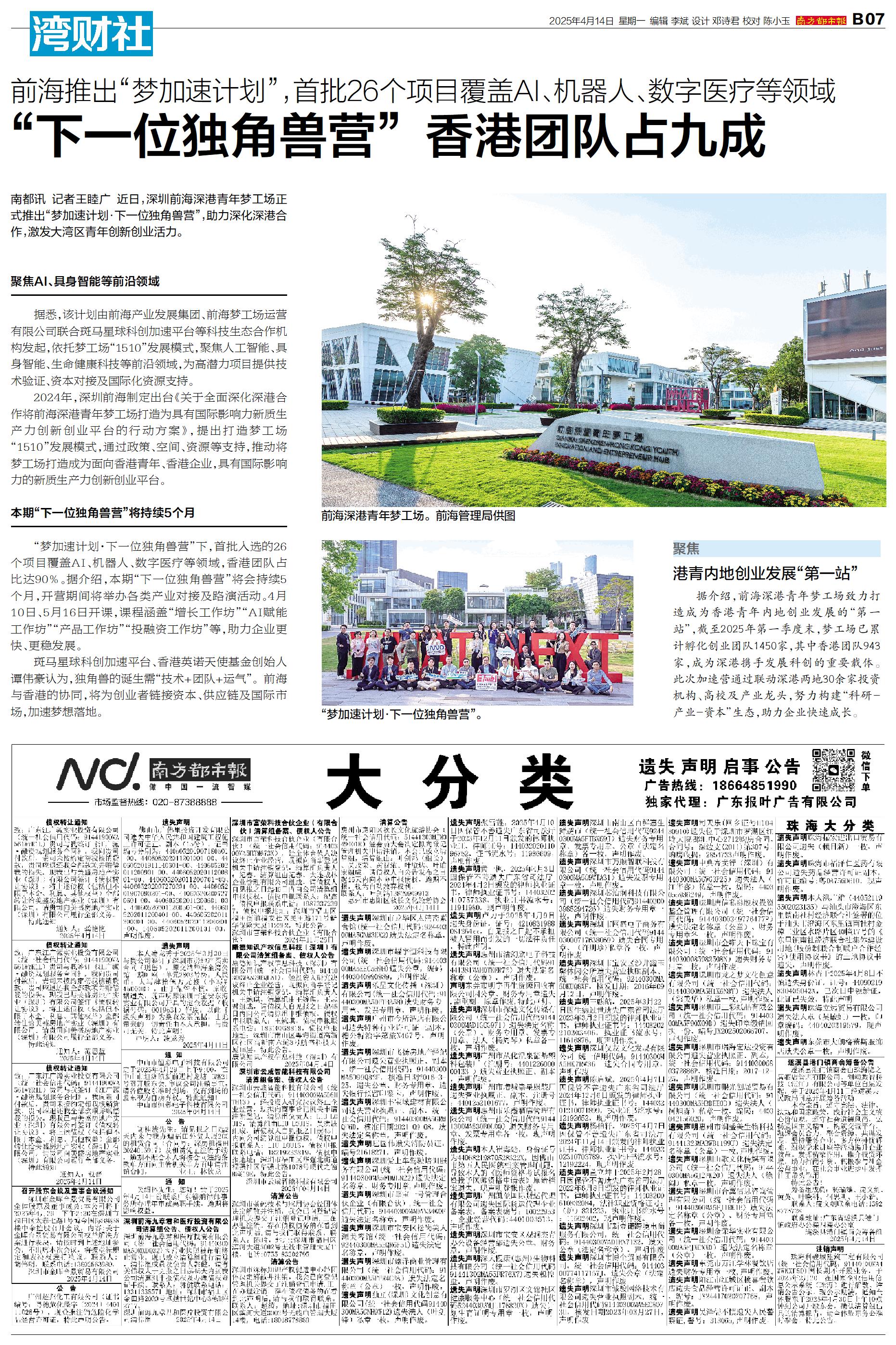 南都讯 记者王睦广 近日,深圳前海深港青年梦工场正式推出“梦加速计划·下一位独角兽营”,助力深化深港合作,激发大湾区青年创新创业活力。 聚焦AI、具身智能等前沿领域 据悉,该计划由前海产业