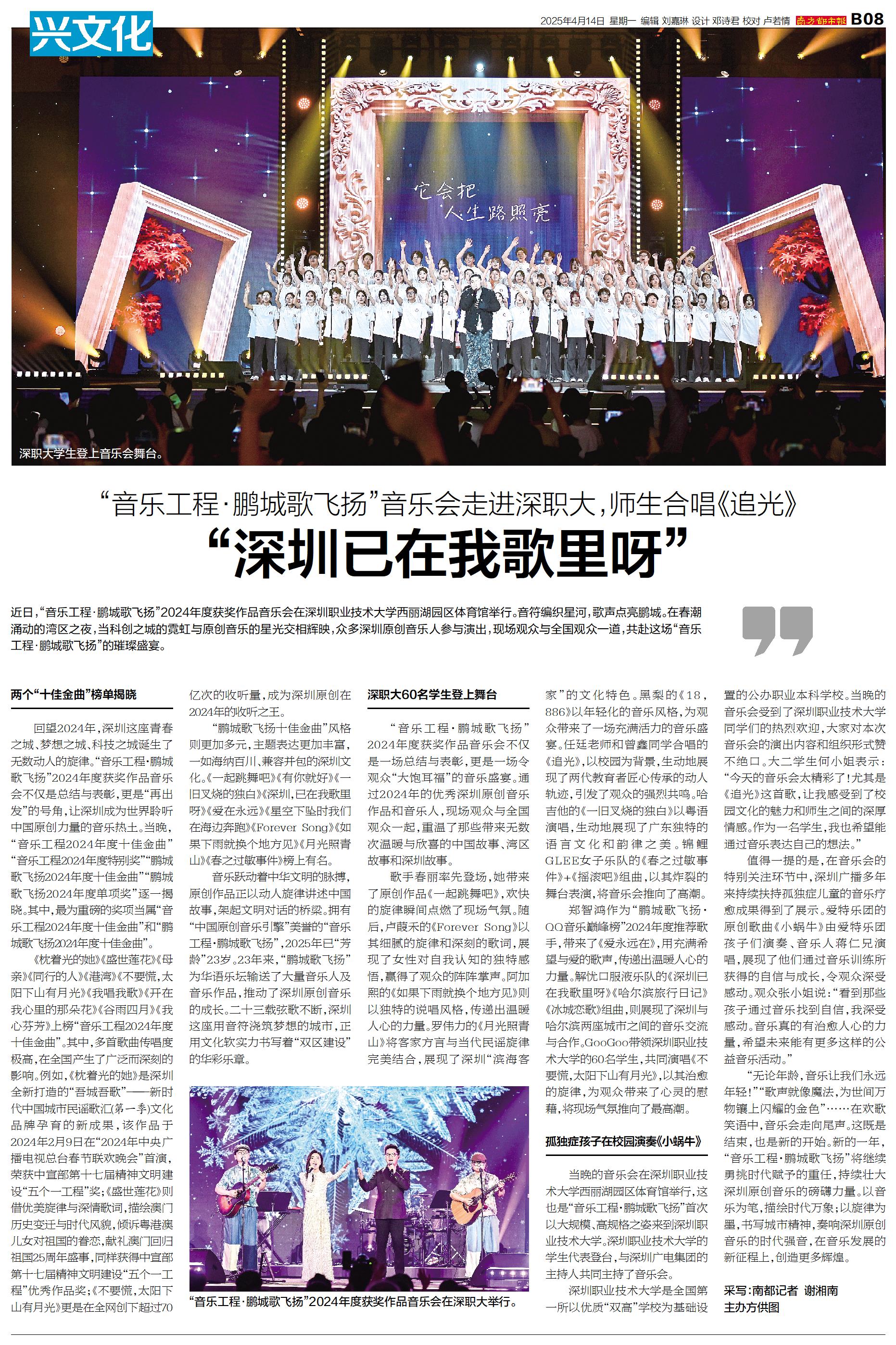 近日,“音乐工程·鹏城歌飞扬”2024年度获奖作品音乐会在深圳职业技术大学西丽湖园区体育馆举行。音符编织星河,歌声点亮鹏城。在春潮涌动的湾区之夜,当科创之城的霓虹与原创音乐的星光交相辉映,众多深圳