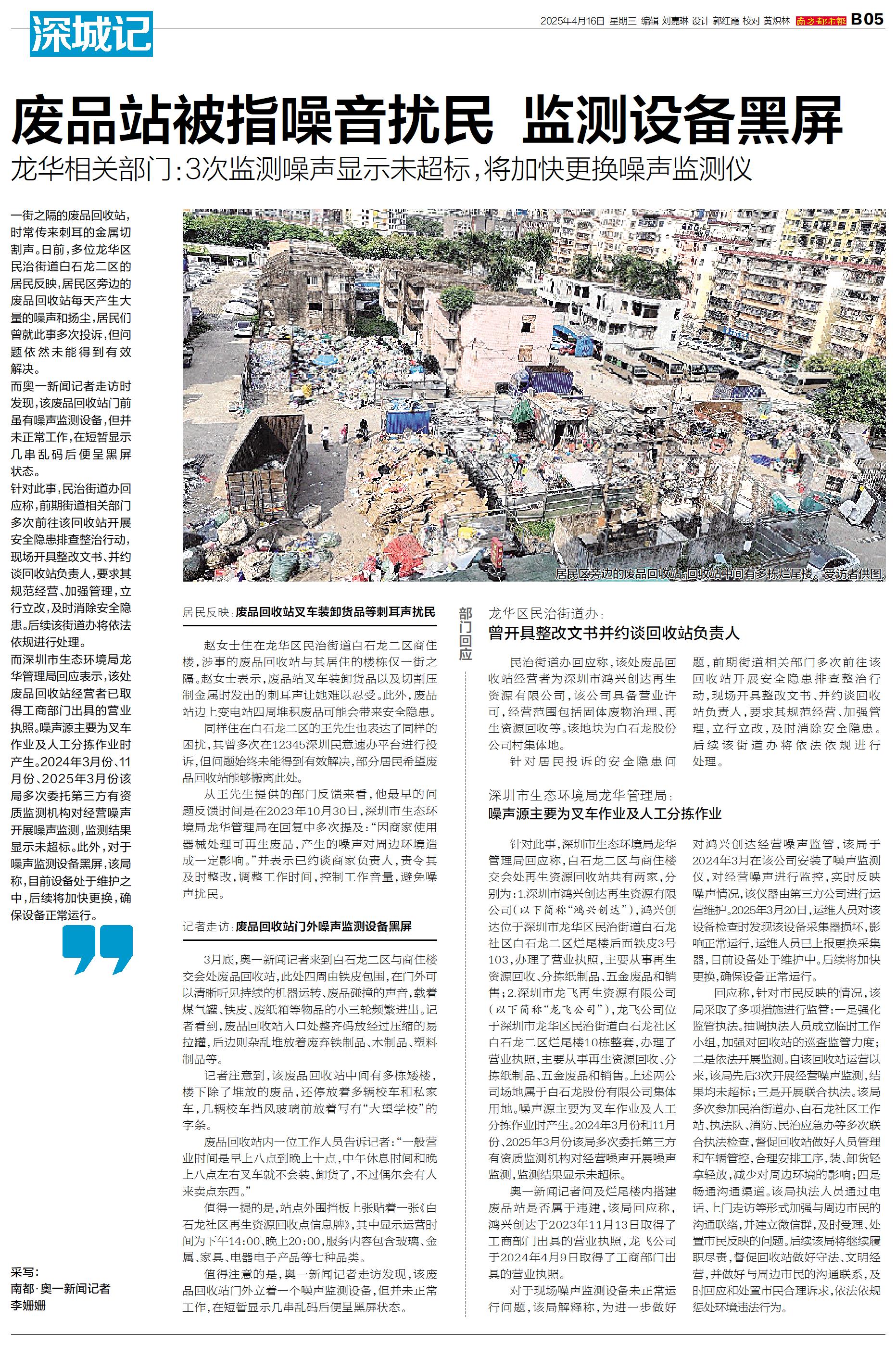 一街之隔的废品回收站,时常传来刺耳的金属切割声。日前,多位龙华区民治街道白石龙二区的居民反映,居民区旁边的废品回收站每天产生大量的噪声和扬尘,居民们曾就此事多次投诉,但问题依然未能得到有效解决。