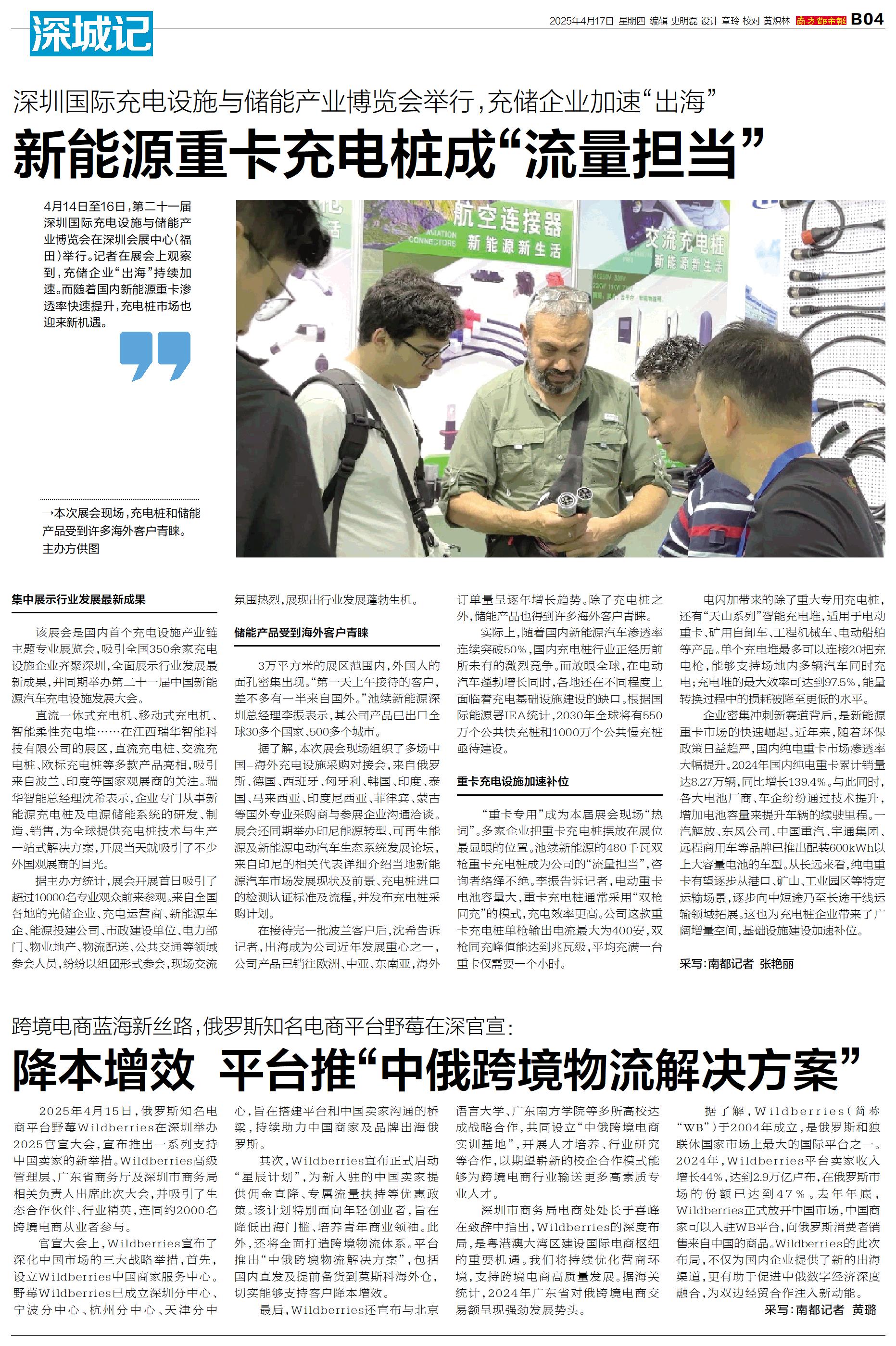 4月14日至16日,第二十一届深圳国际充电设施与储能产业博览会在深圳会展中心(福田)举行。记者在展会上观察到,充储企业“出海”持续加速。而随着国内新能源重卡渗透率快速提升,充电桩市场也迎来新机遇。