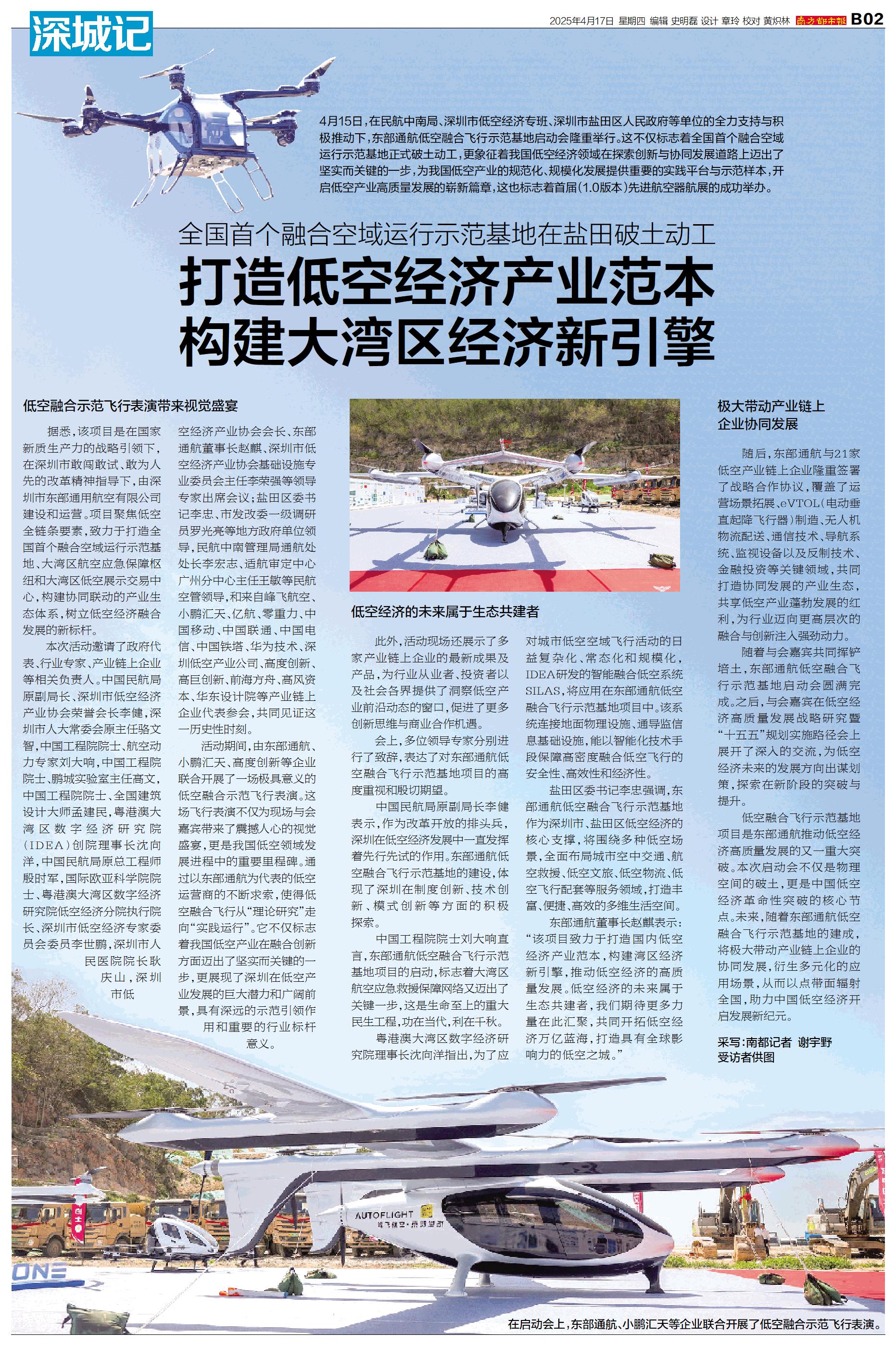 4月15日,在民航中南局、深圳市低空经济专班、深圳市盐田区人民政府等单位的全力支持与积极推动下,东部通航低空融合飞行示范基地启动会隆重举行。这不仅标志着全国首个融合空域运行示范基地正式破土动工,更