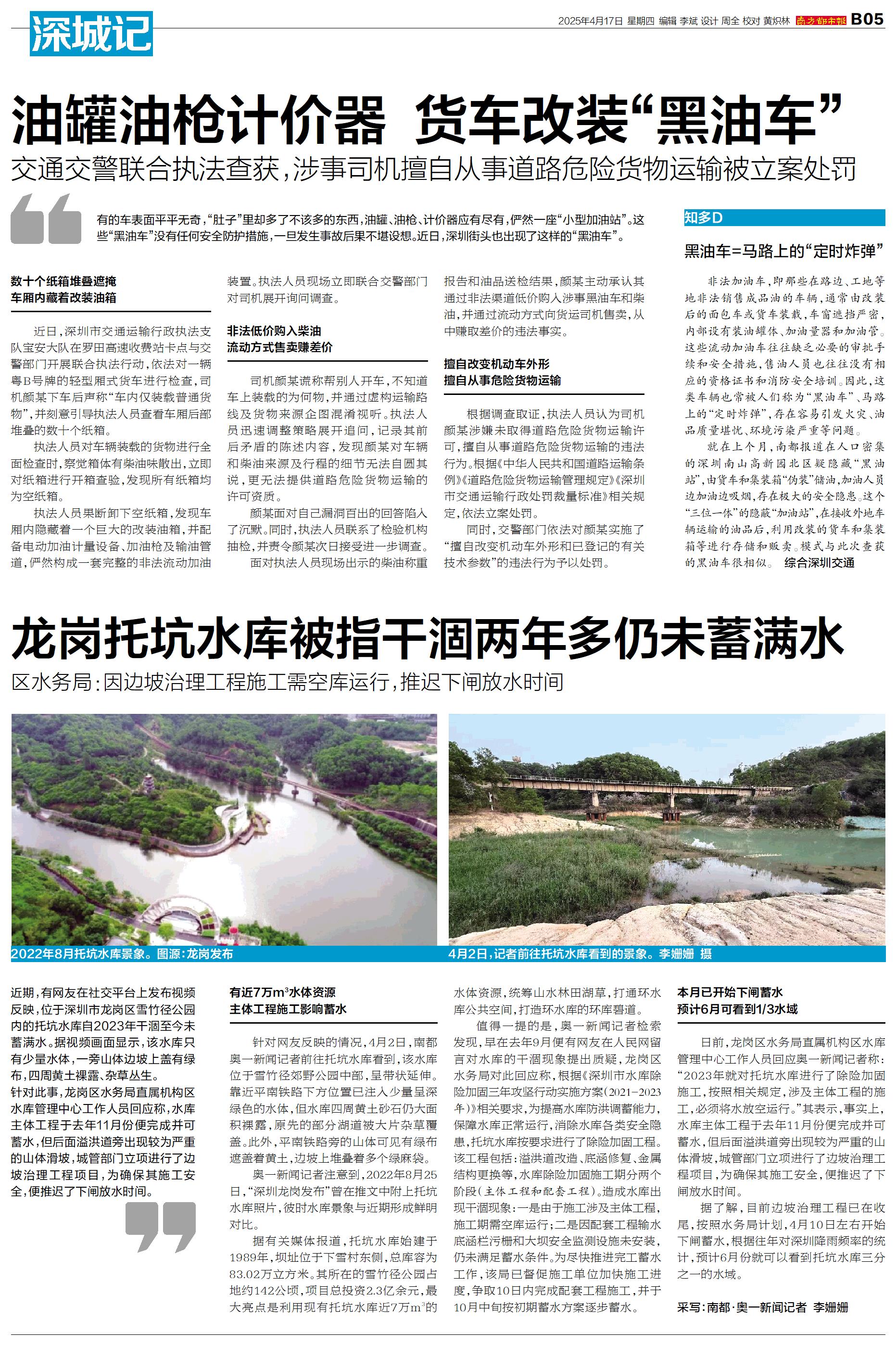 近期,有网友在社交平台上发布视频反映,位于深圳市龙岗区雪竹径公园内的托坑水库自2023年干涸至今未蓄满水。据视频画面显示,该水库只有少量水体,一旁山体边坡上盖有绿布,四周黄土裸露、杂草丛生。 针