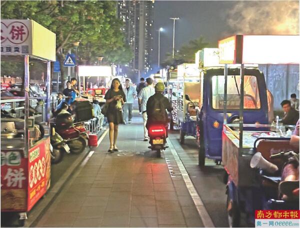 坪山区江岭路的人行道与非机动车道并不算宽敞,非机动车道“全面失守”,被密集摆卖的移动摊位挤占得严严实实,购买东西的市民站在人行道上点餐,这样行人的空间就会被压缩,尤其是傍晚人流量大的时候,行人与非机动车混行,极易产生危险。南都报道出街后,该情况也并未得到明显整改,南都记者回访时,便看到有电动车在人群中穿行,一路按喇叭艰难行驶,记者也几次差点被行驶的电动车剐蹭。