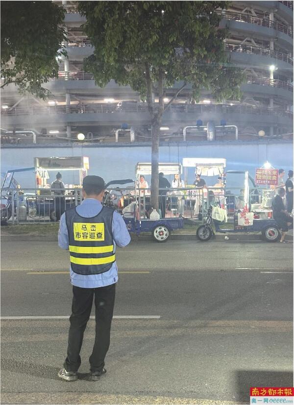 16日晚上7时许,南都记者再次回访现场时,现场摊位依然热火朝天。一辆执法电瓶车此时刚好停在路口,两名工作人员下车后,披上了有“马峦市容巡查”字样的反光马甲,呵斥两家占据斑马线摆摊的摊贩离开,待摊贩离开后,他们拿起手机对着空出来的斑马线拍照,几分钟后上车离去,周围其他摊贩依然泰然自若摆卖。但16日晚上,记者并未看到前一晚举牌的制服人员。