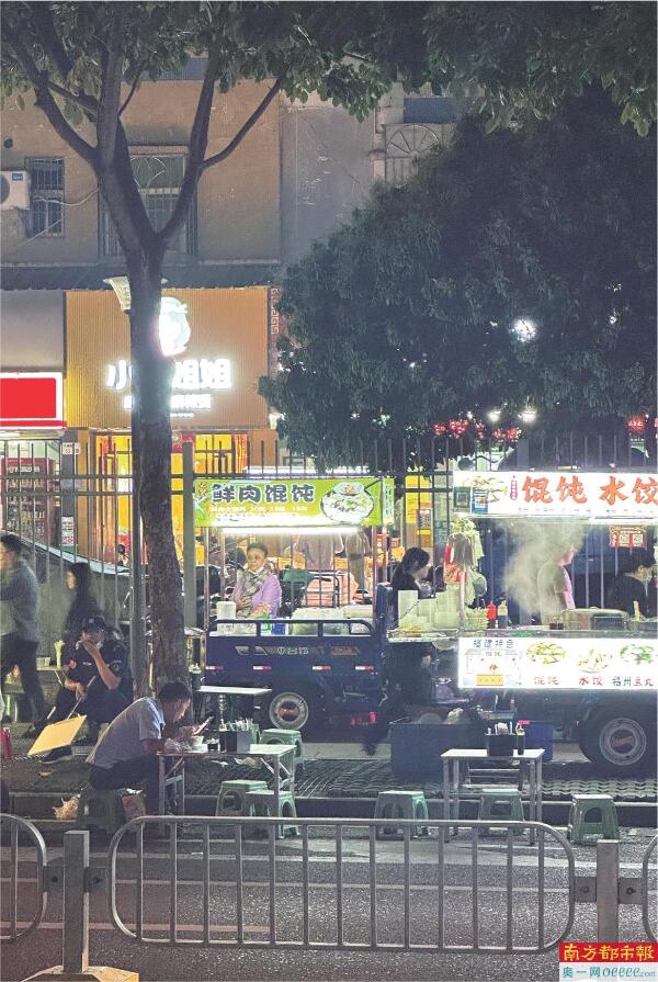 4月15日晚,坪山区江岭路,身穿制服的人员坐在绿化带休息,他面前有食客在机动车道上的小餐桌吃饭。 “圳街评测”报道组 摄