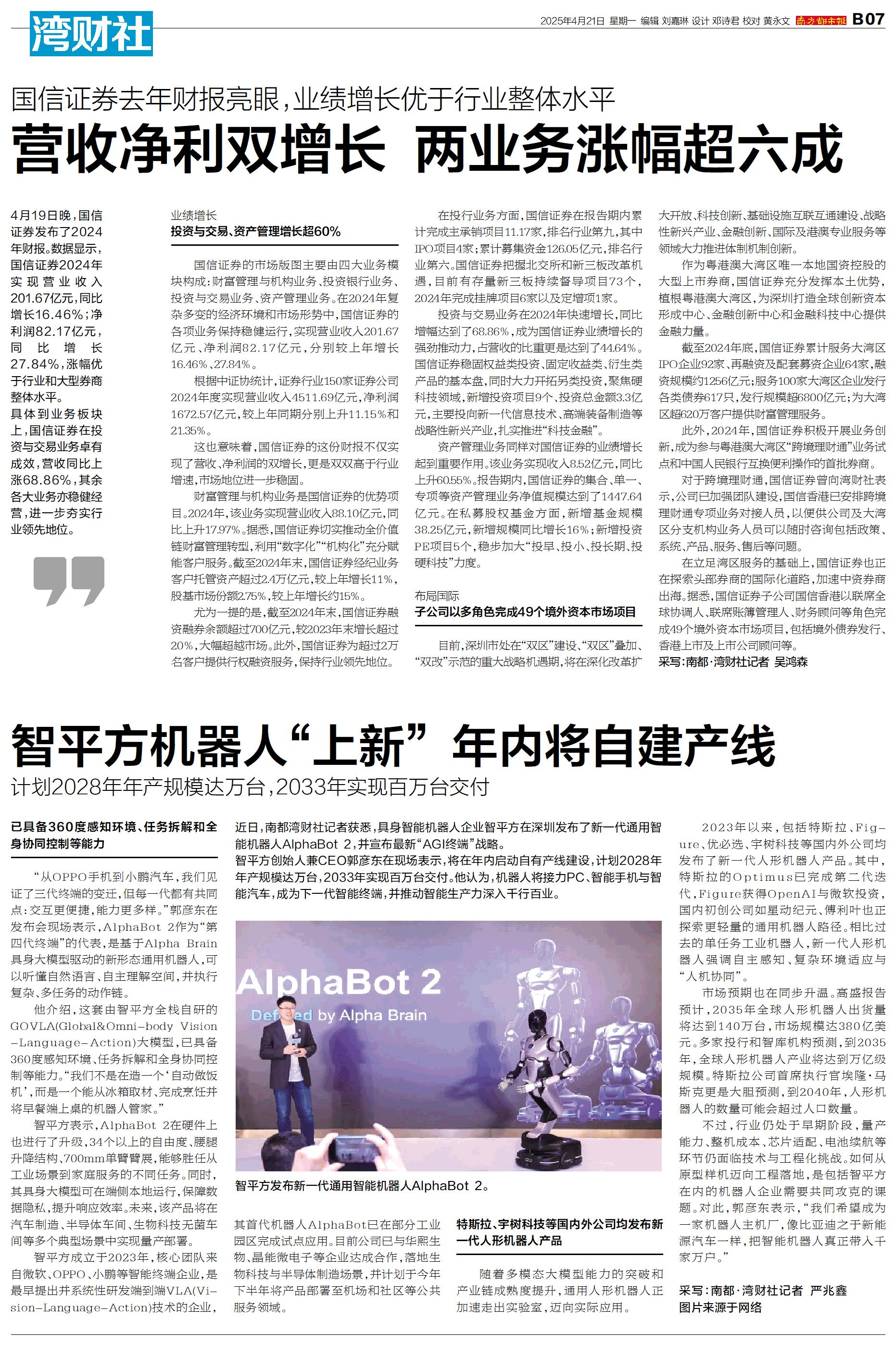 4月19日晚,国信证券发布了2024年财报。数据显示,国信证券2024年实现营业收入201.67亿元,同比增长16.46%;净利润82.17亿元,同比增长27.84%,涨幅优于行业和大型券商整体水