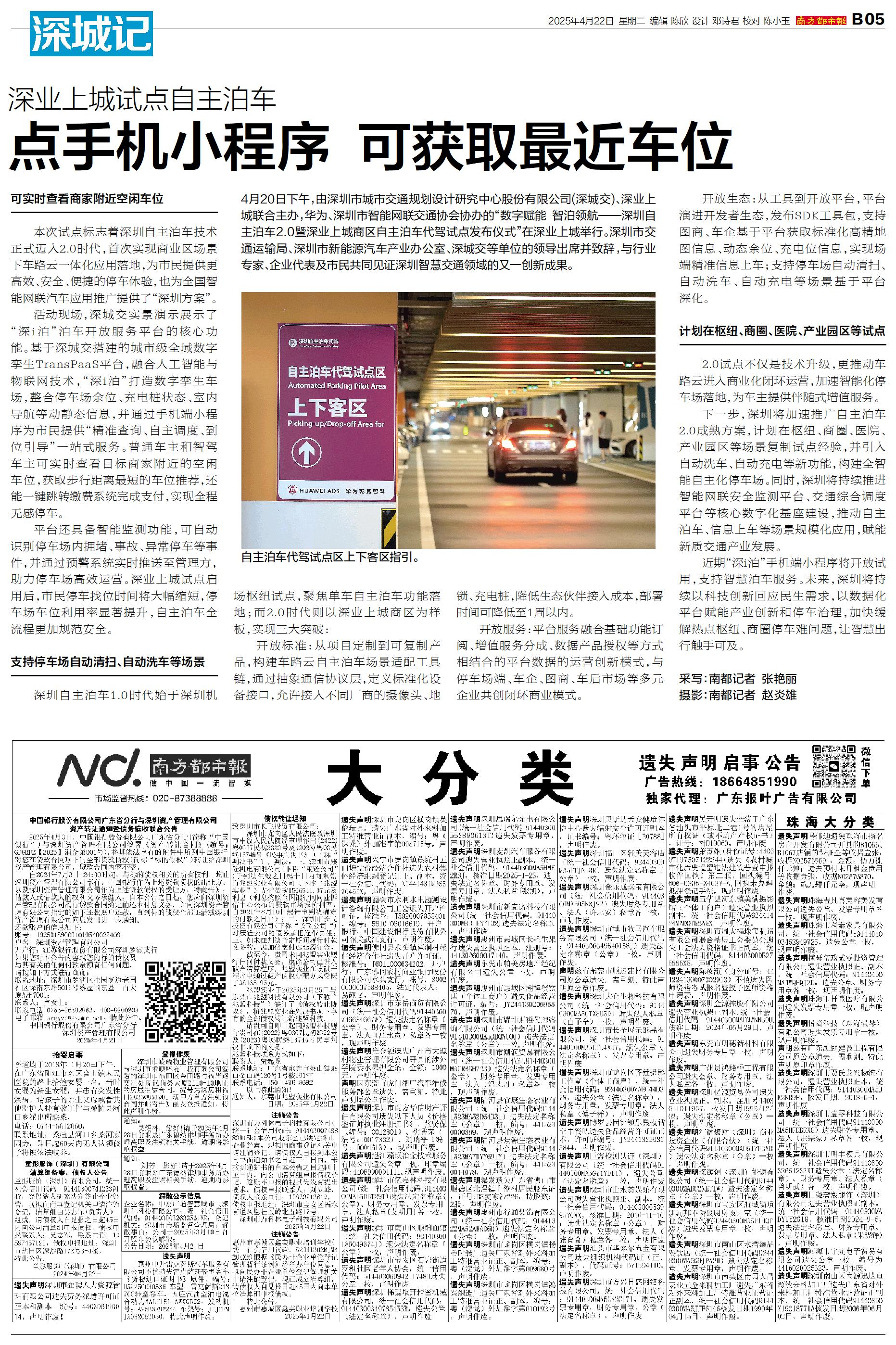 4月20日下午,由深圳市城市交通规划设计研究中心股份有限公司(深城交)、深业上城联合主办,华为、深圳市智能网联交通协会协办的“数字赋能 智泊领航——深圳自主泊车2.0暨深业上城商区自主泊车代驾试点