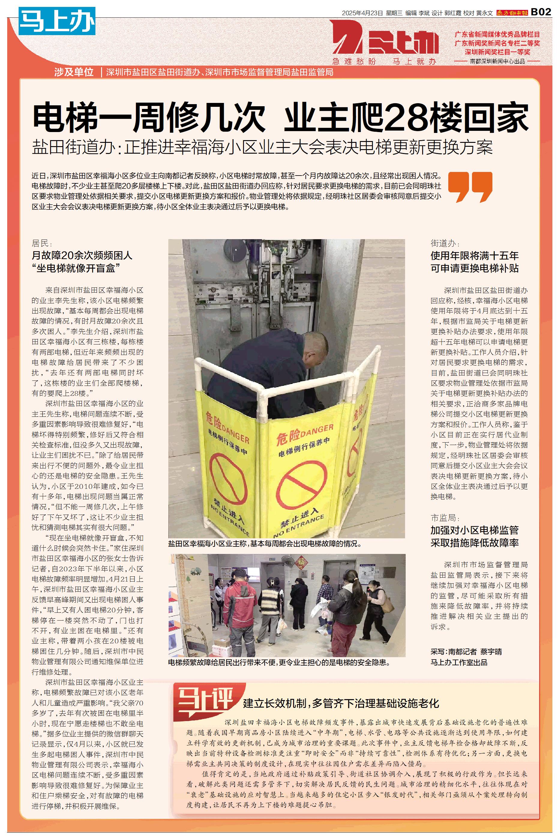 涉及单位 深圳市盐田区盐田街道办、深圳市市场监督管理局盐田监管局 近日,深圳市盐田区幸福海小区多位业主向南都记者反映称,小区电梯时常故障,甚至一个月内故障达20余次,且经常出现困人情况。电梯故