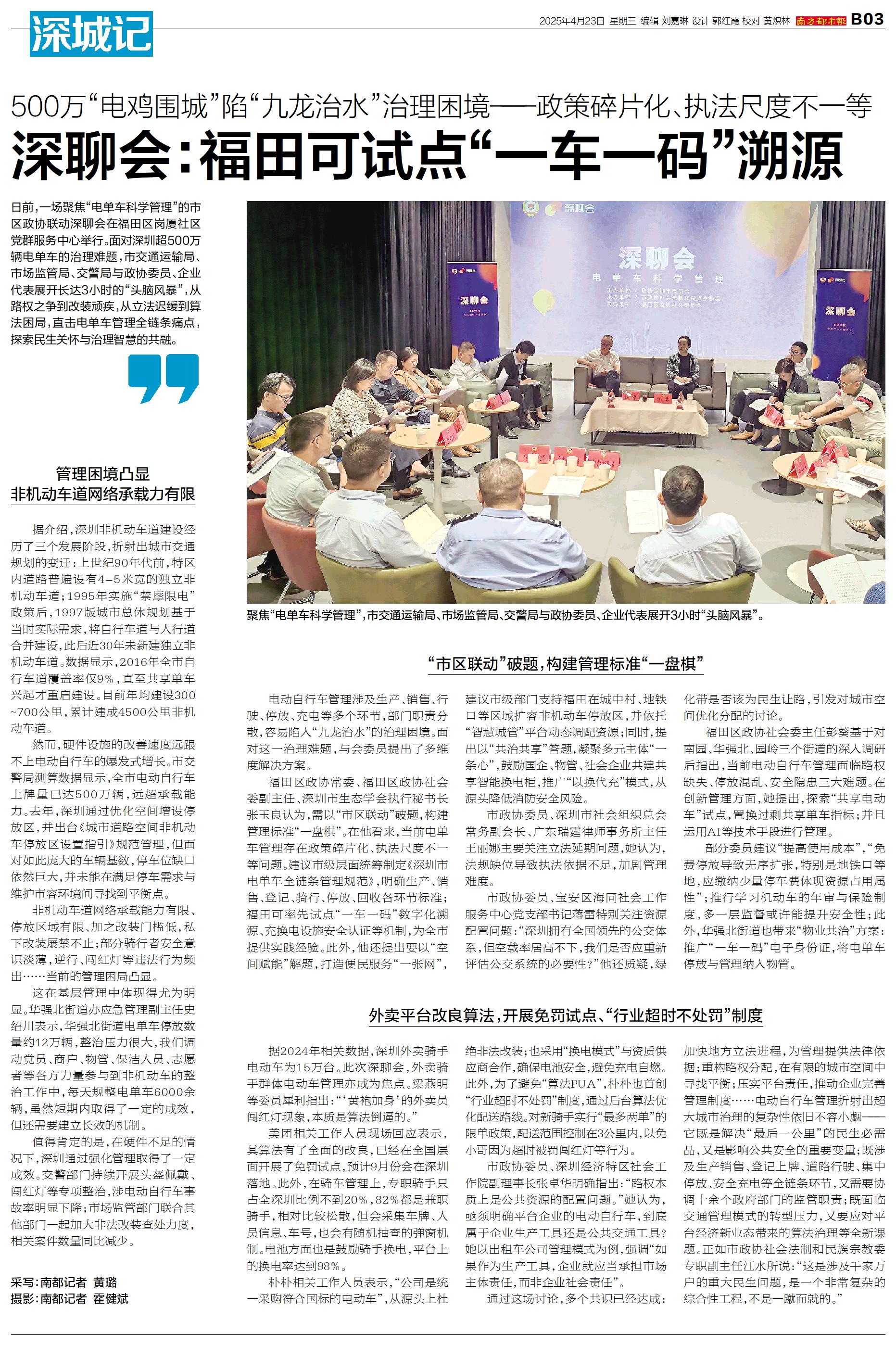 日前,一场聚焦“电单车科学管理”的市区政协联动深聊会在福田区岗厦社区党群服务中心举行。面对深圳超500万辆电单车的治理难题,市交通运输局、市场监管局、交警局与政协委员、企业代表展开长达3小时的“头