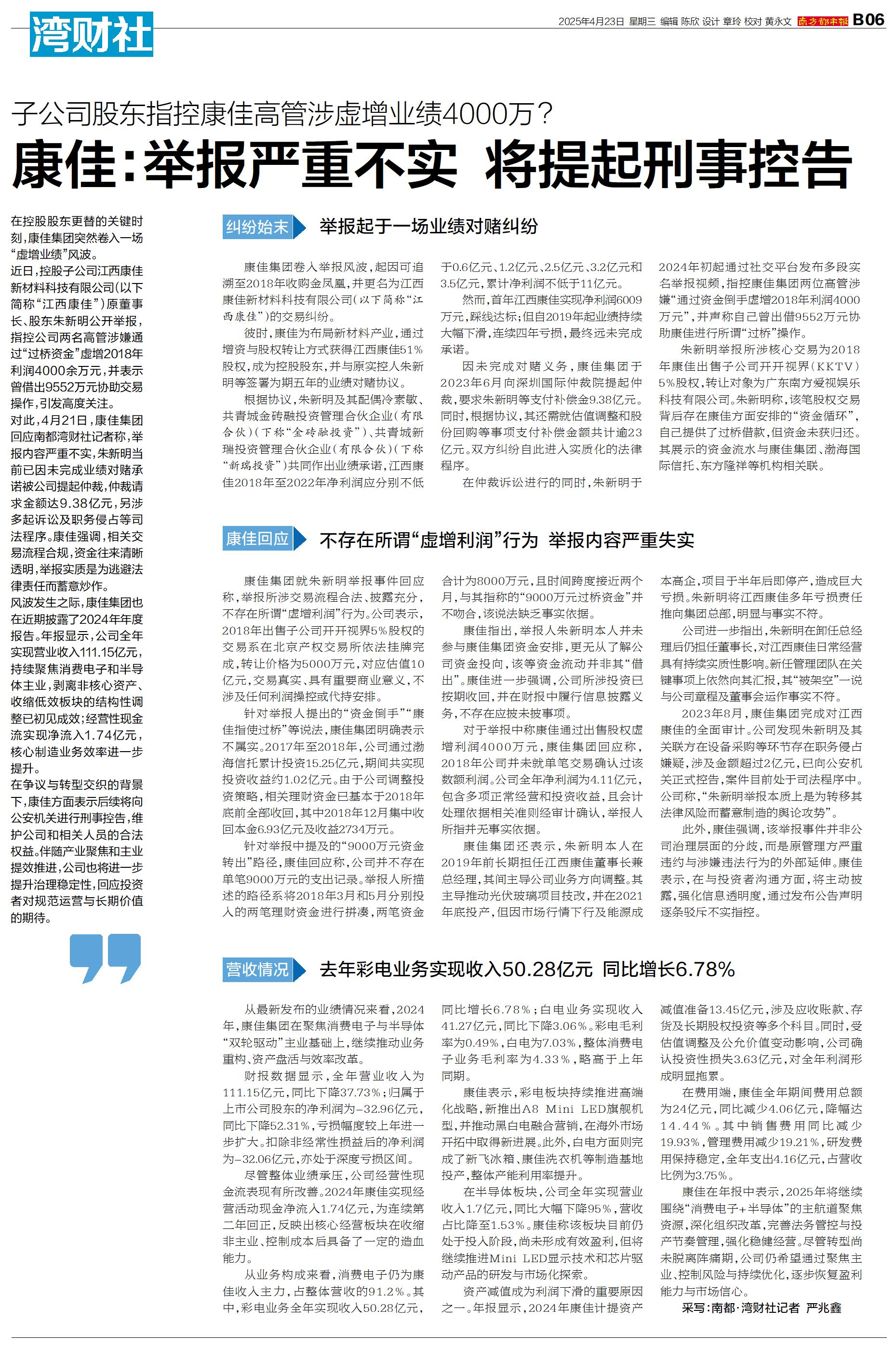 在控股股东更替的关键时刻,康佳集团突然卷入一场“虚增业绩”风波。 近日,控股子公司江西康佳新材料科技有限公司(以下简称“江西康佳”)原董事长、股东朱新明公开举报,指控公司两名高管涉嫌通过“过桥资