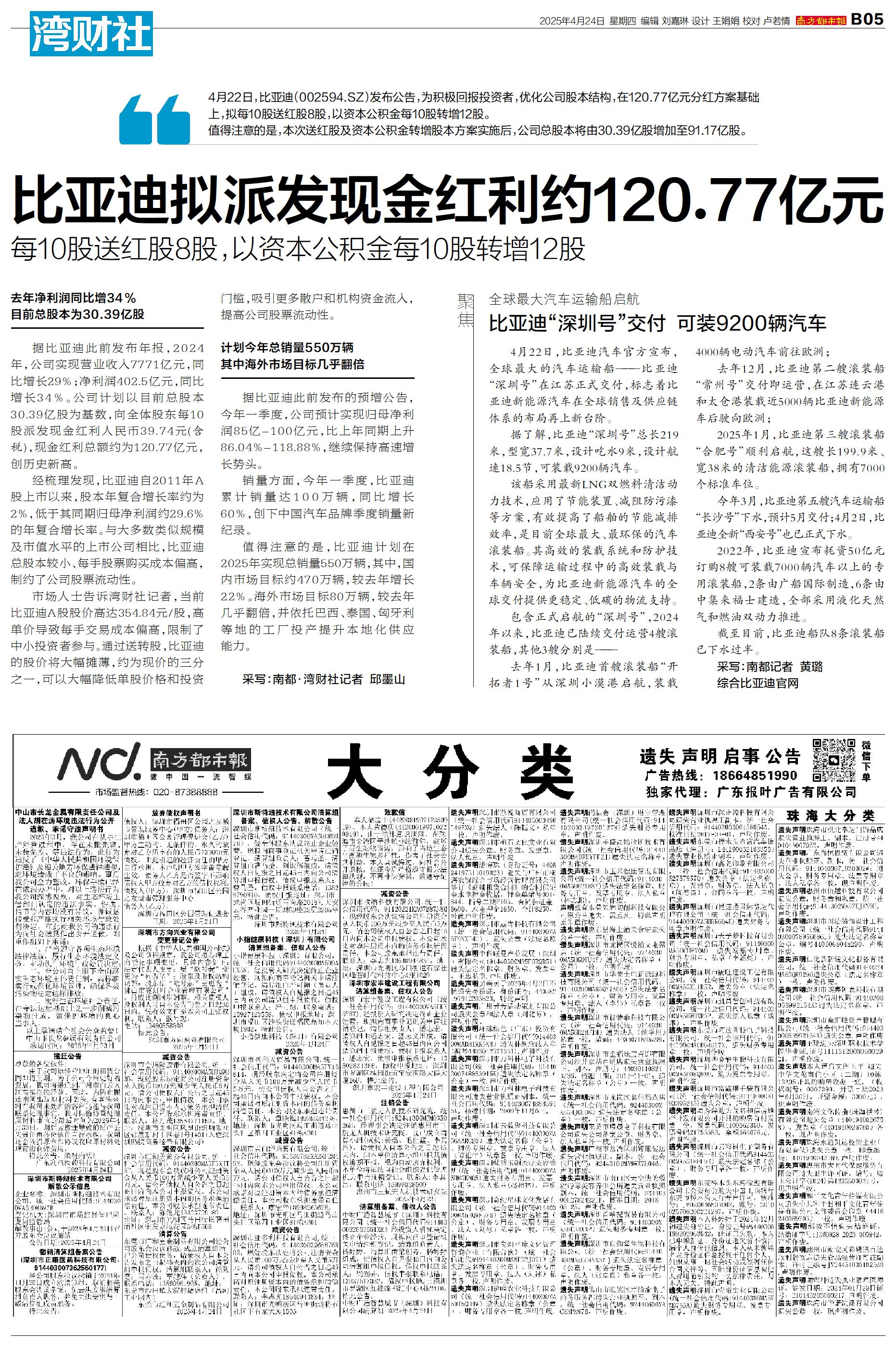 4月22日,比亚迪(002594.SZ)发布公告,为积极回报投资者,优化公司股本结构,在120.77亿元分红方案基础上,拟每10股送红股8股,以资本公积金每10股转增12股。 值得注意的是,本次