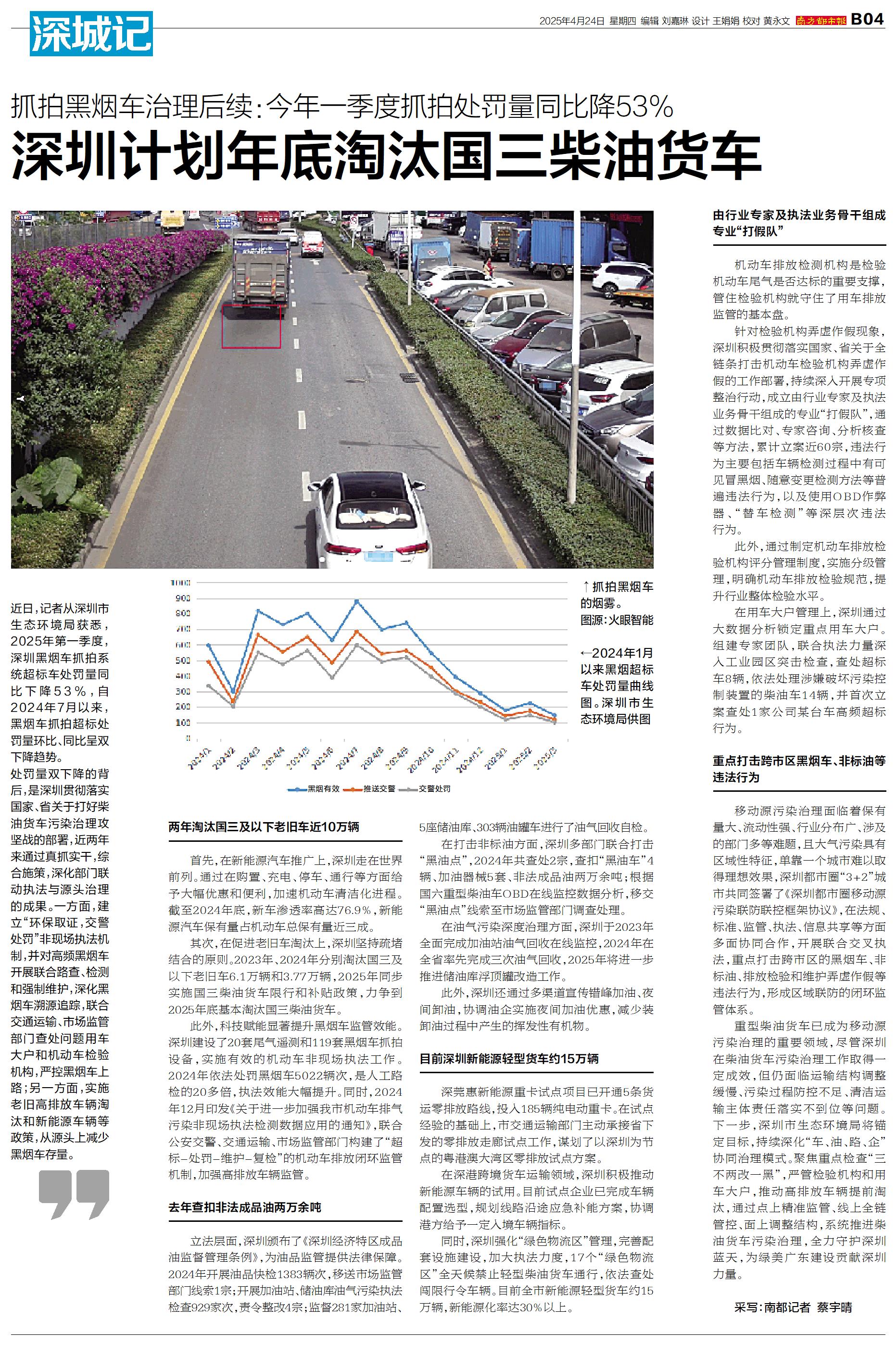 抓拍黑烟车的烟雾。 图源:火眼智能 2024年1月以来黑烟超标车处罚量曲线图。深圳市生态环境局供图 近日,记者从深圳市生态环境局获悉,2025