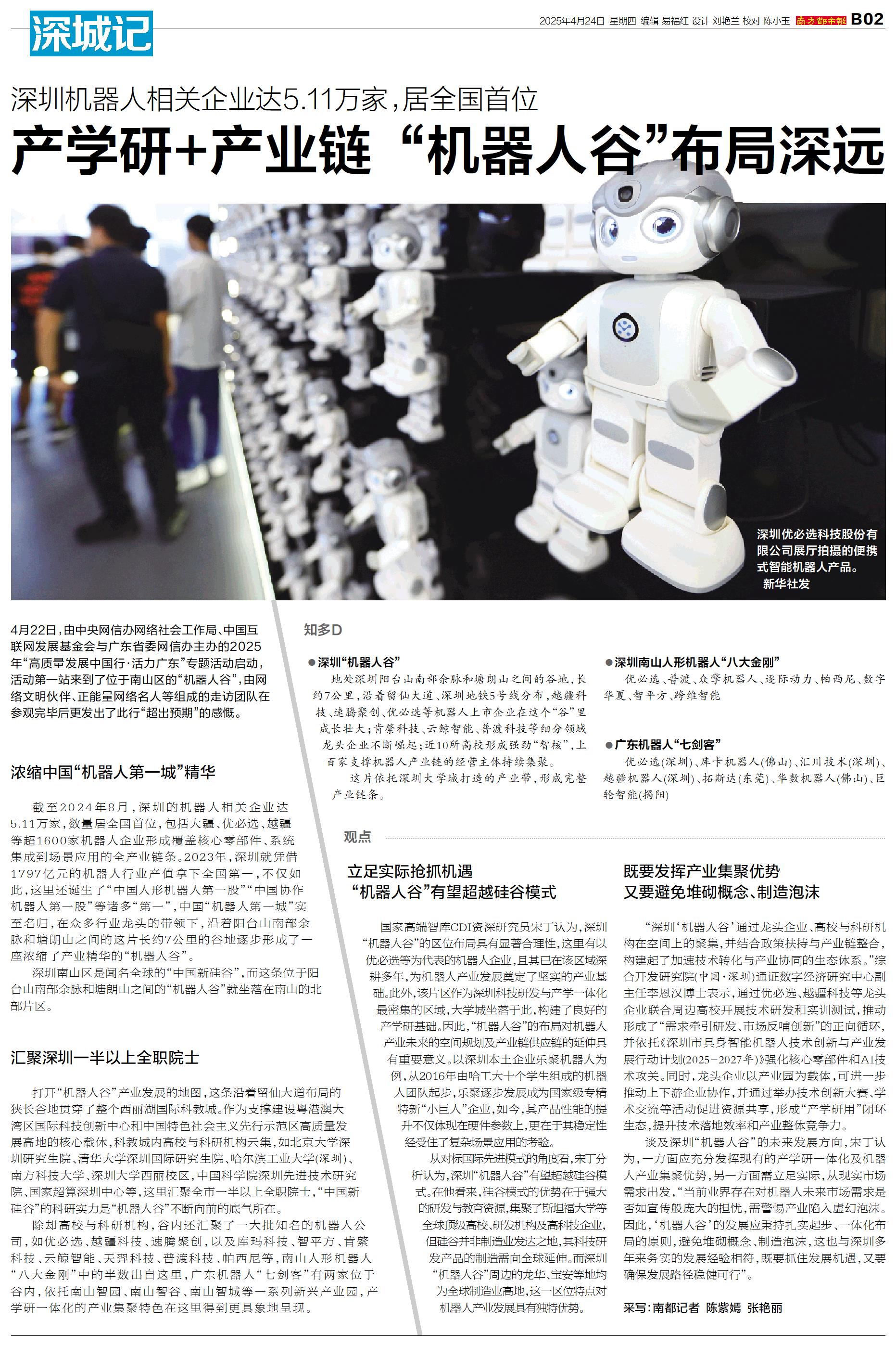 4月22日,由中央网信办网络社会工作局、中国互联网发展基金会与广东省委网信办主办的2025年“高质量发展中国行·活力广东”专题活动启动,活动第一站来到了位于南山区的“机器人谷”,由网络文明伙伴、正