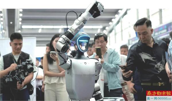 首届机器人全产业链接会昨日在深开幕,将持续至4月26日。图为宇树科技的机器人向观众挥手。