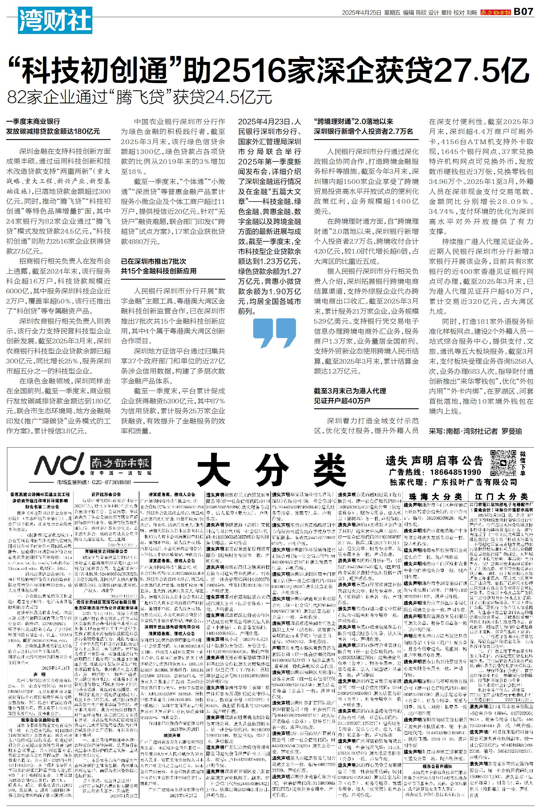 2025年4月23日,人民银行深圳市分行、国家外汇管理局深圳市分局联合举行2025年第一季度新闻发布会,详细介绍了深圳金融运行情况及在金融“五篇大文章”——科技金融、绿色金融、普惠金融、数字金融以
