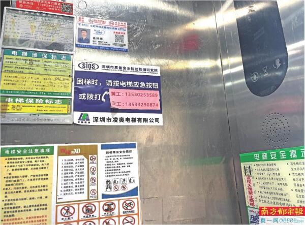 该小区电梯使用单位为深圳市中民物业管理有限公司绿色盐港家园管理处,正式接管该小区约3个月,维保单位为深圳市凌奥电梯有限公司。6部电梯最近一次维保日期均为2025年4月16日,下次维保日期为2025年4月30日,下次检验日期为2026年2月。南都记者在现场看到,该小区6台电梯均已安装电梯一键报警视频终端服务系统,并能提供正常服务。