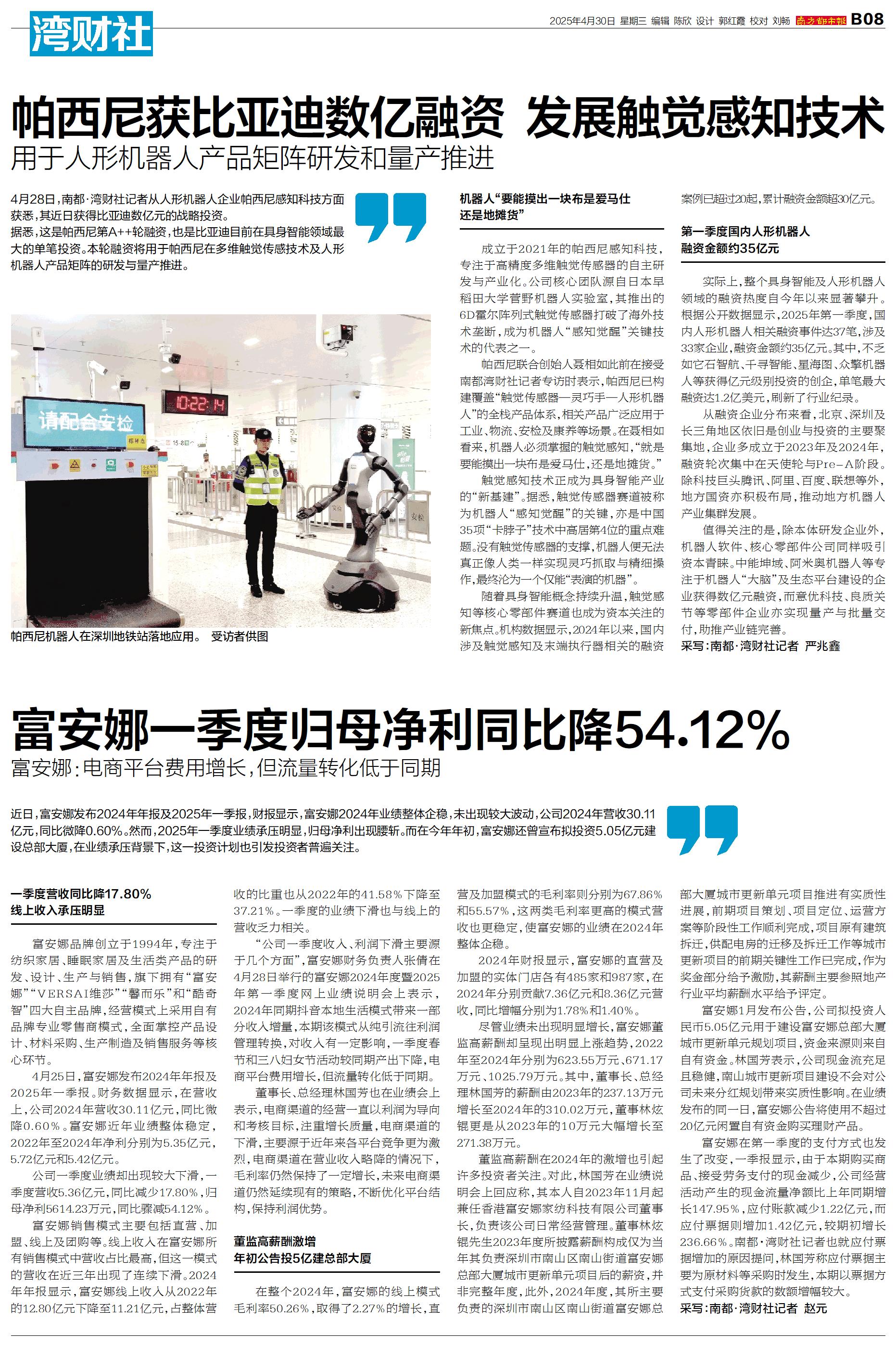 4月28日,南都·湾财社记者从人形机器人企业帕西尼感知科技方面获悉,其近日获得比亚迪数亿元的战略投资。 据悉,这是帕西尼第A++轮融资,也是比亚迪目前在具身智能领域最大的单笔投资。本轮融资将用于