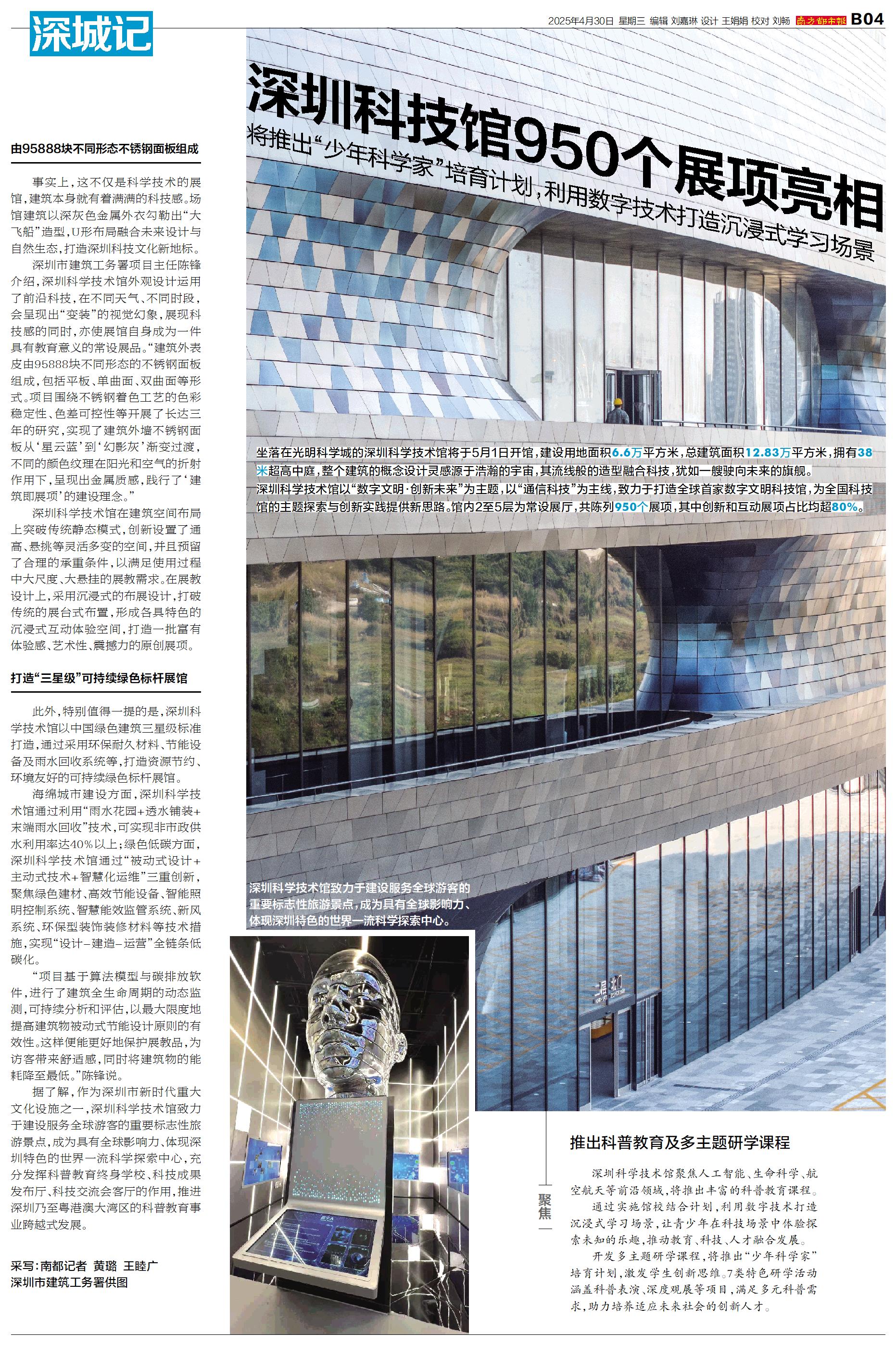 坐落在光明科学城的深圳科学技术馆将于5月1日开馆,建设用地面积6.6万平方米,总建筑面积12.83万平方米,拥有38米超高中庭,整个建筑的概念设计灵感源于浩瀚的宇宙,其流线般的造型融合科技,犹如一