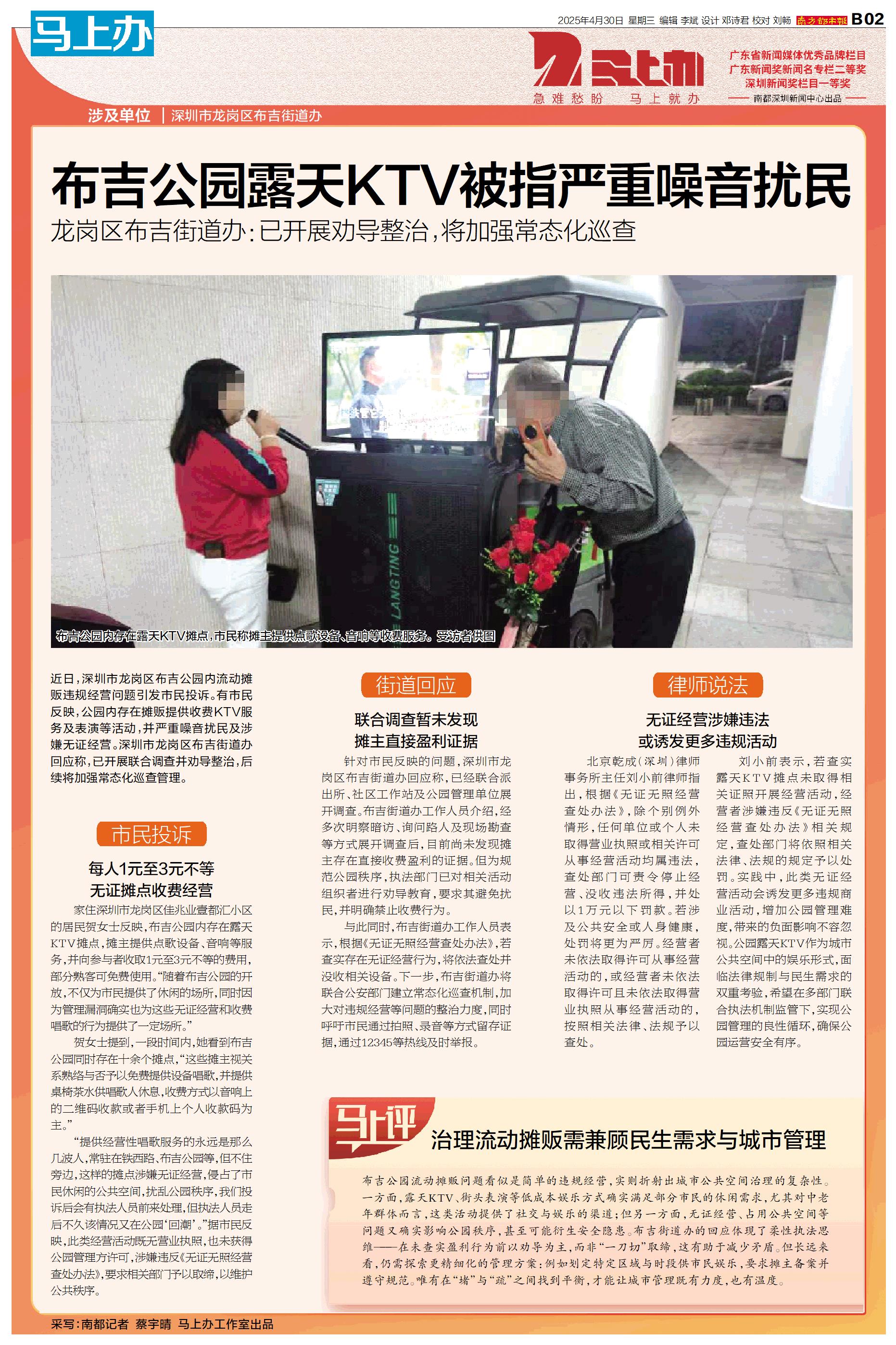涉及单位 深圳市龙岗区布吉街道办 近日,深圳市龙岗区布吉公园内流动摊贩违规经营问题引发市民投诉。有市民反映,公园内存在摊贩提供收费KTV服务及表演等活动,并严重噪音扰民及涉嫌无证经营。深圳市龙