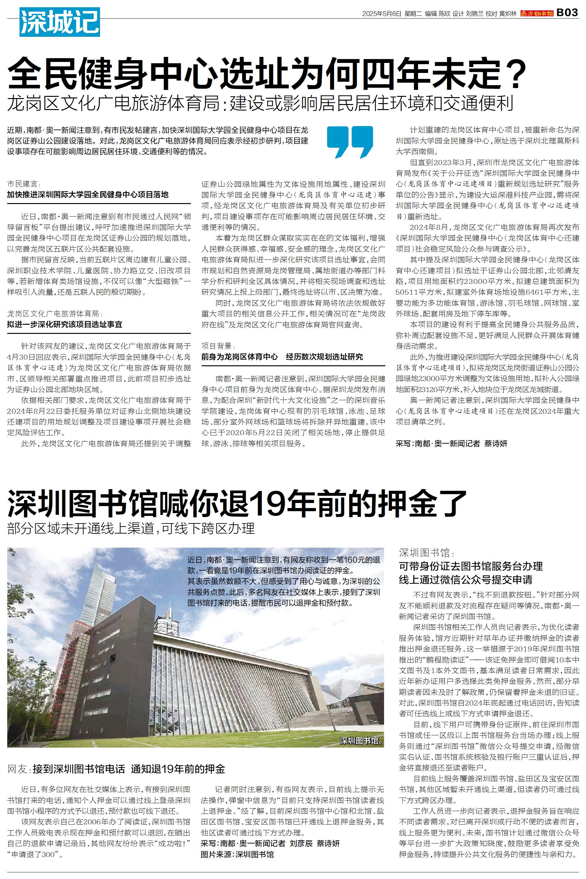 近期,南都·奥一新闻注意到,有市民发帖建言,加快深圳国际大学园全民健身中心项目在龙岗区证券山公园建设落地。对此,龙岗区文化广电旅游体育局回应表示经初步研判,项目建设事项存在可能影响周边居民居住环境、交通便利等的情况。