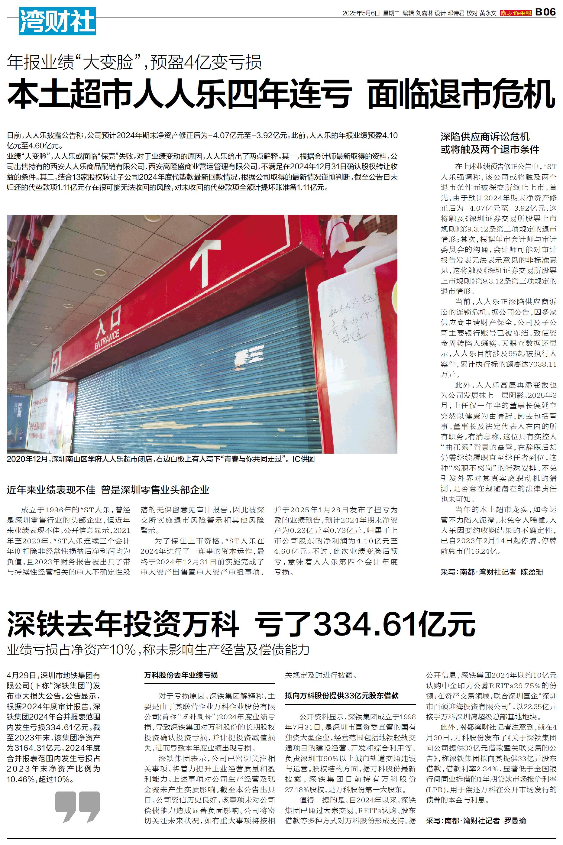 日前,人人乐披露公告称,公司预计2024年期末净资产修正后为-4.07亿元至-3.92亿元。此前,人人乐的年报业绩预盈4.10亿元至4.60亿元。 业绩“大变脸”,人人乐或面临“保壳”失败。对于