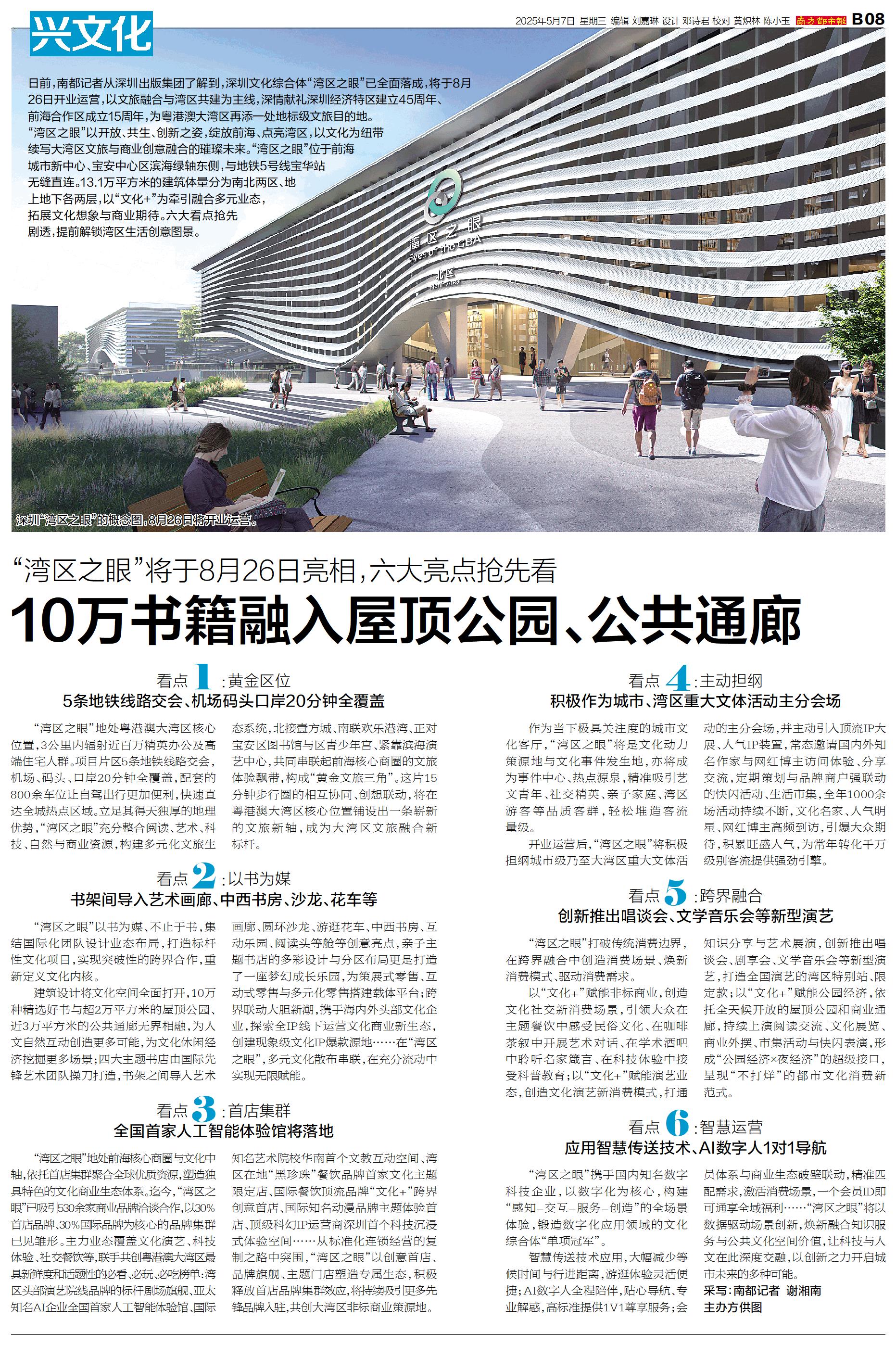 日前,南都记者从深圳出版集团了解到,深圳文化综合体“湾区之眼”已全面落成,将于8月26日开业运营,以文旅融合与湾区共建为主线,深情献礼深圳经济特区建立45周年、前海合作区成立15周年,为粤港澳大湾