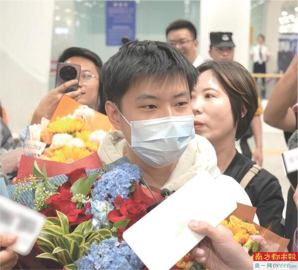 北京时间5月8日傍晚5点45分,中国、亚洲首位斯诺克世锦赛冠军赵心童携奖杯抵达深圳宝安国际机场,引发现场球迷欢呼。南都记者 吴春熠 冷锋 摄