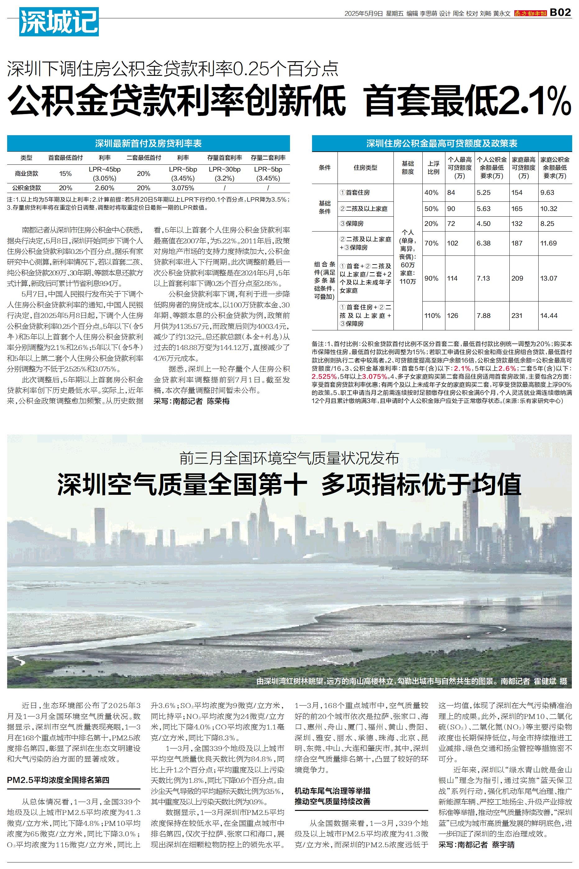 南都记者从深圳市住房公积金中心获悉,据央行决定,5月8日,深圳开始同步下调个人住房公积金贷款利率0.25个百分点。据乐有家研究中心测算,新利率情况下,若以首套二孩、纯公积金贷款209万、30年期、
