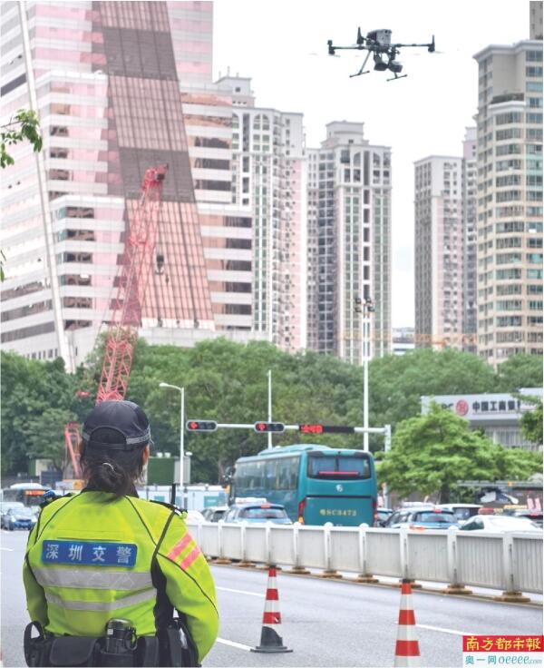 “深圳交警空中巡逻,该路段为严管区,请非机动车立即驶离”。5月9日上午10时许,随着警用无人机的喊话声在深南大道深南中路路段上空响起,深圳交警持续开展电动自行车交通秩序整治行动。此次行动中,大型警务无人机首次投入执法,以“空中震慑+地面联勤”的立体执法模式,对电动自行车交通违法行为进行严厉打击。