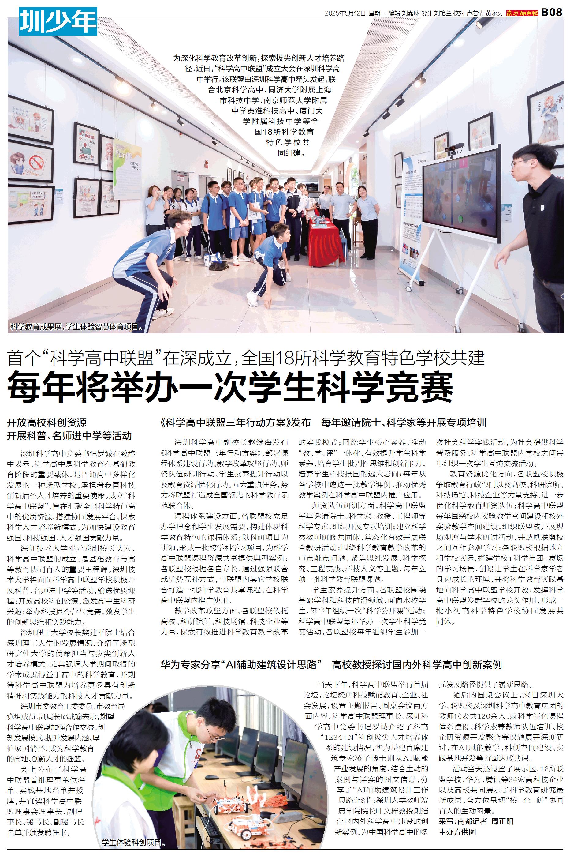 为深化科学教育改革创新,探索拔尖创新人才培养路径,近日,“科学高中联盟”成立大会在深圳科学高中举行。该联盟由深圳科学高中牵头发起,联合北京科学高中、同济大学附属上海市科技中学、南京师范大学附属中学