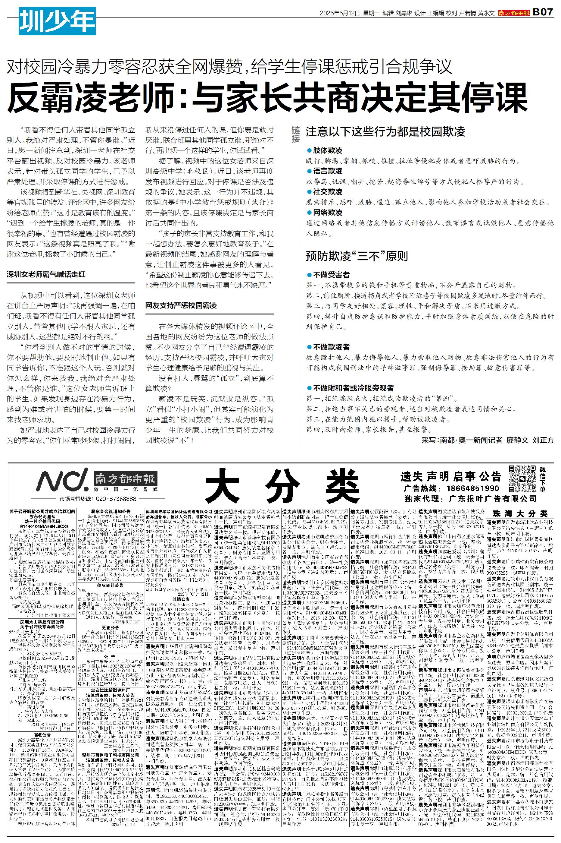 “我看不得任何人带着其他同学孤立别人。我绝对严肃处理,不管你是谁。”近日,奥一新闻注意到,深圳一老师在社交平台晒出视频,反对校园冷暴力。该老师表示,针对带头孤立同学的学生,已予以严肃处理,并采取停