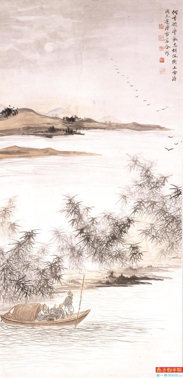 何香凝与廖承志、胡佩衡、王雪涛、周元亮、溥雪斋合作的作品《把酒当歌》。