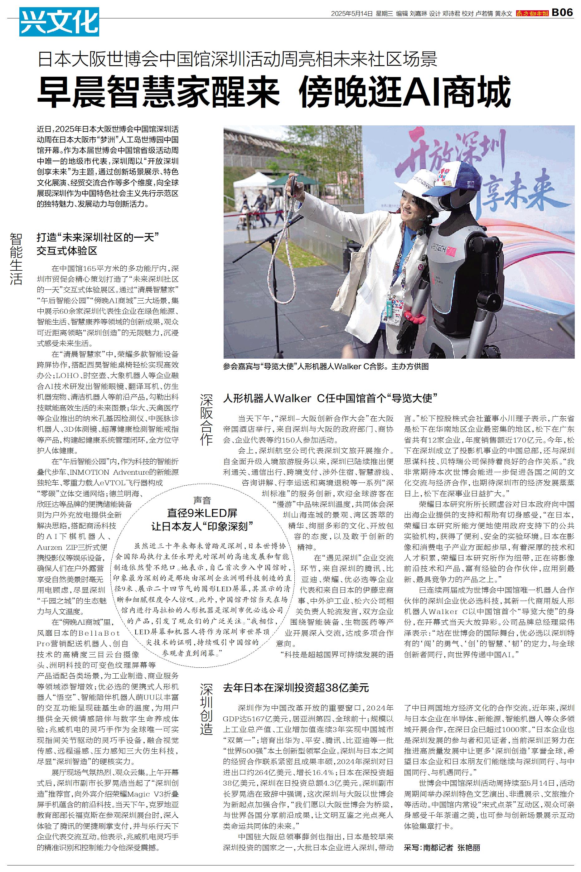 近日,2025年日本大阪世博会中国馆深圳活动周在日本大阪市“梦洲”人工岛世博园中国馆开幕。作为本届世博会中国馆省级活动周中唯一的地级市代表,深圳周以“开放深圳 创享未来”为主题,通过创新场景展示、