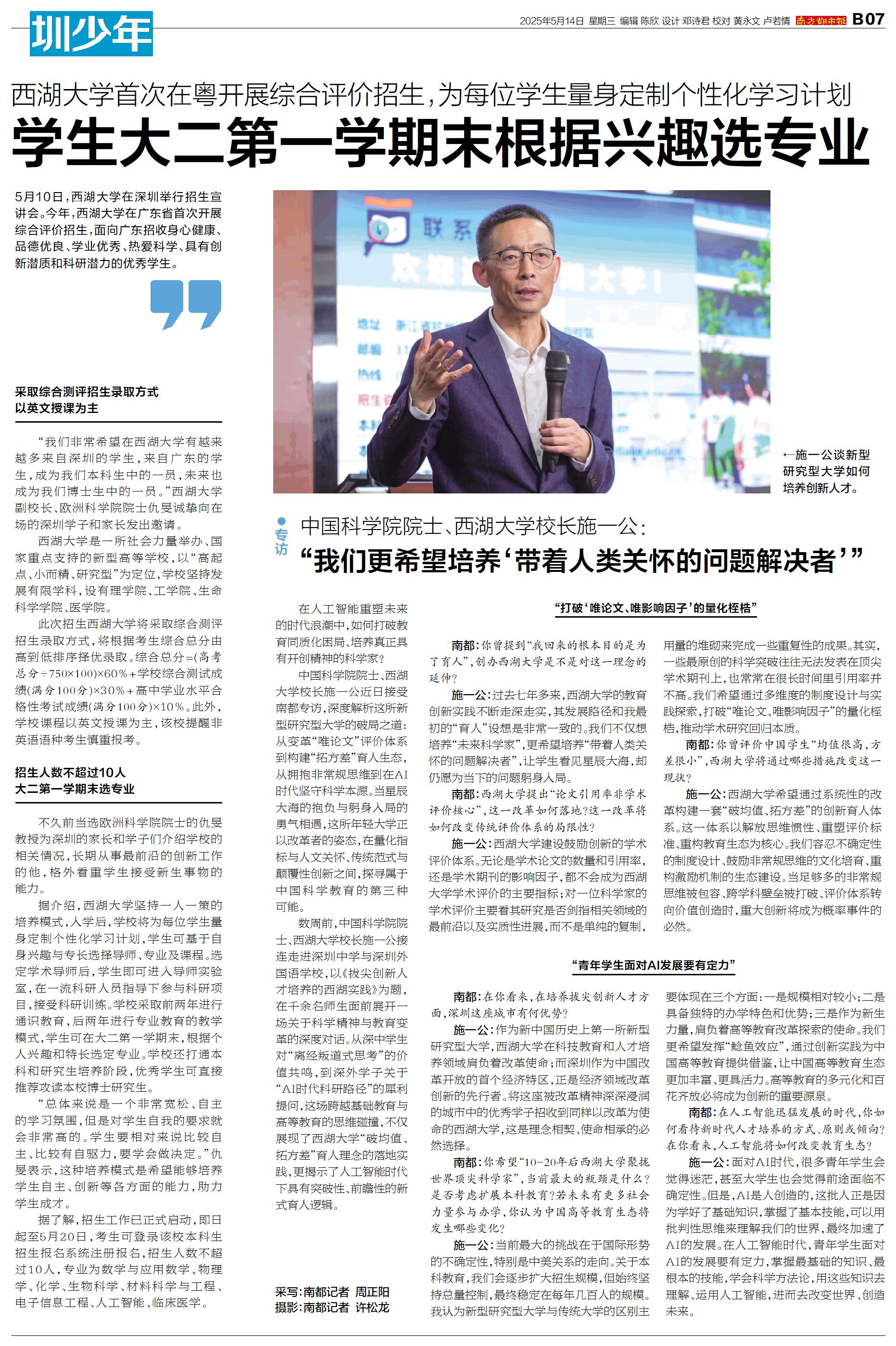 5月10日,西湖大学在深圳举行招生宣讲会。今年,西湖大学在广东省首次开展综合评价招生,面向广东招收身心健康、品德优良、学业优秀、热爱科学、具有创新潜质和科研潜力的优秀学生。 采取综合测评招生录取