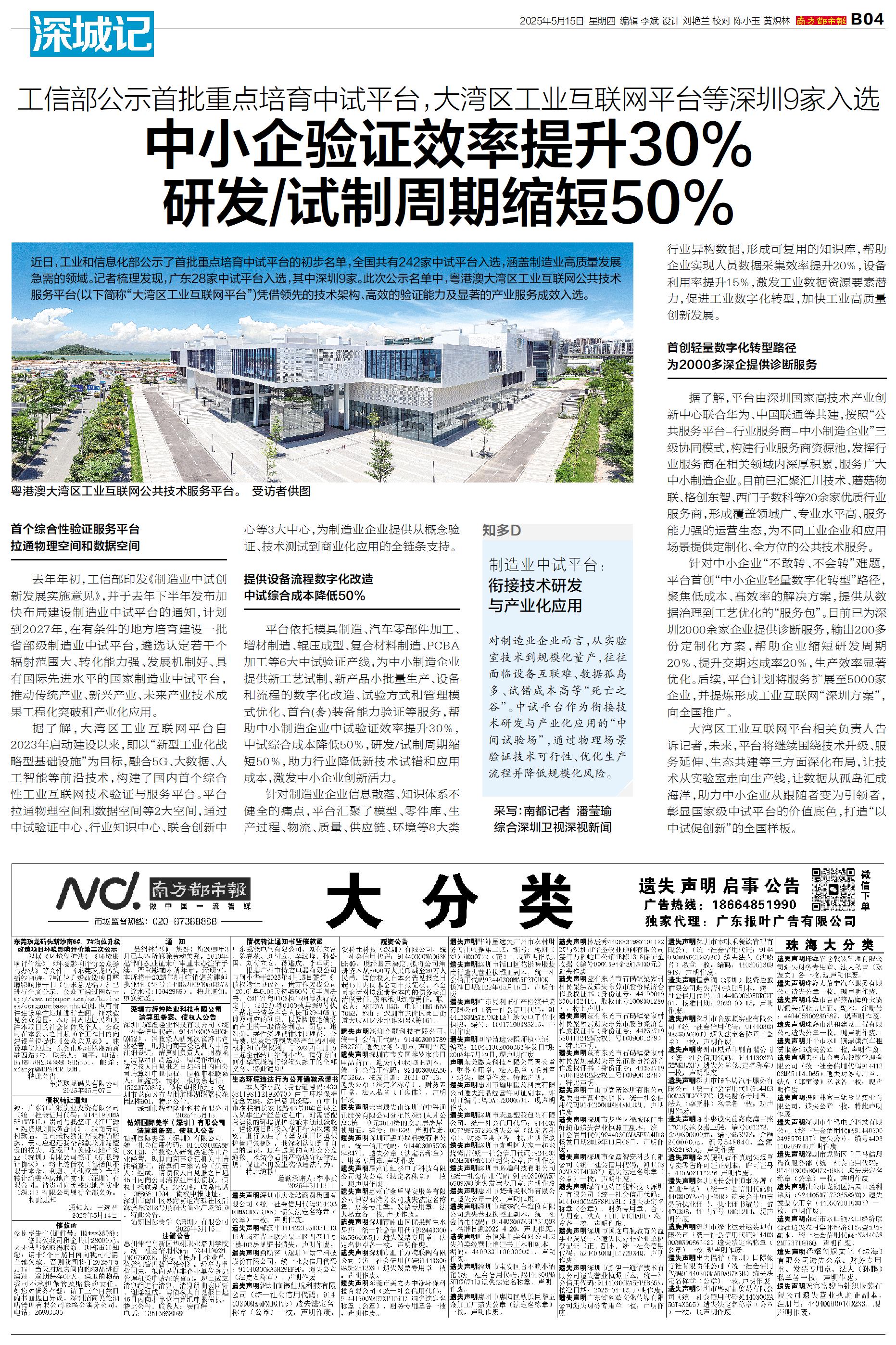 近日,工业和信息化部公示了首批重点培育中试平台的初步名单,全国共有242家中试平台入选,涵盖制造业高质量发展急需的领域。记者梳理发现,广东28家中试平台入选,其中深圳9家。此次公示名单中,粤港澳大湾区工业互联网公共技术服务平台(以下简称“大湾区工业互联网平台”)凭借领先的技术架构、高效的验证能力及显著的产业服务成效入选。