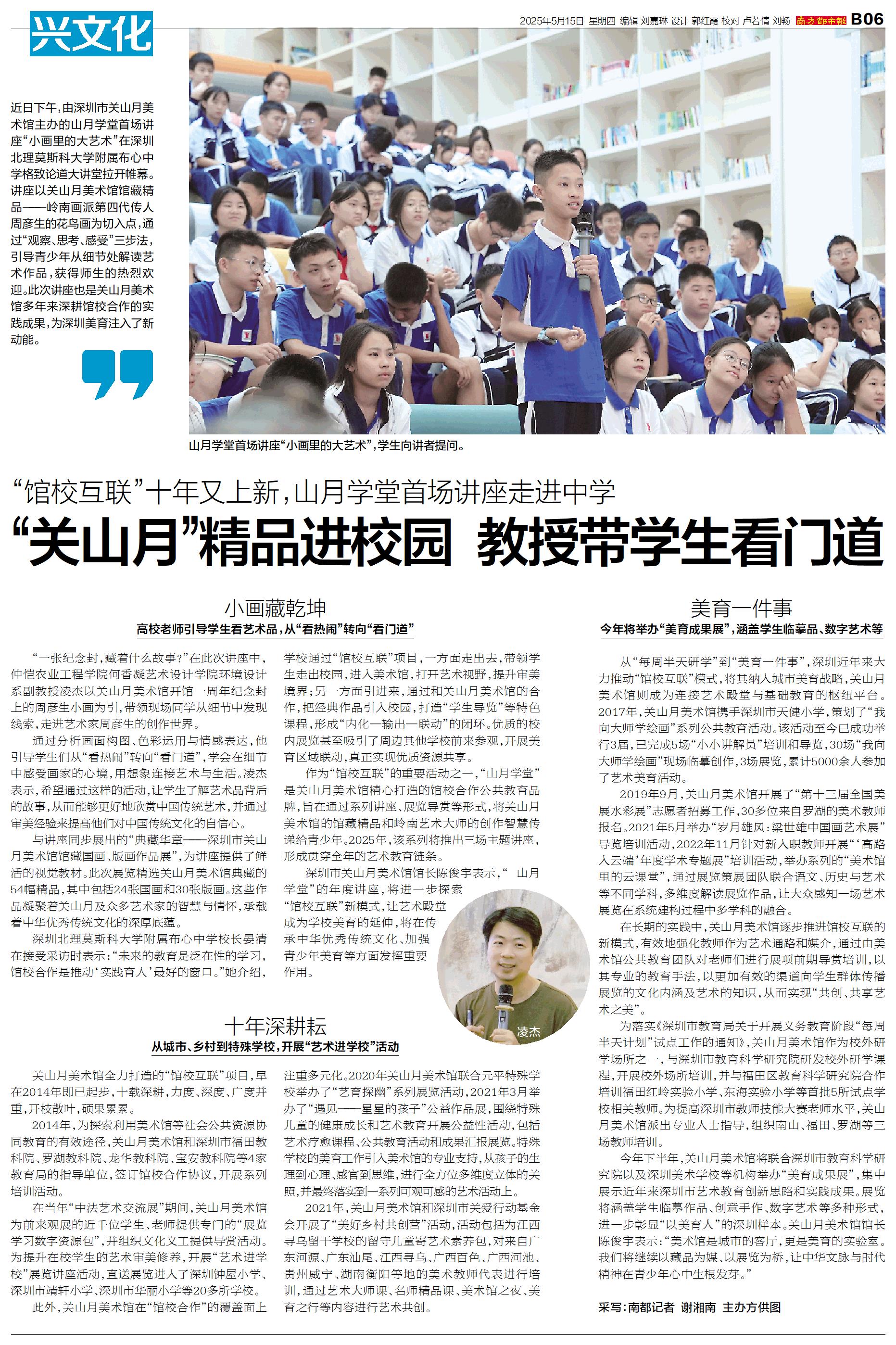 深圳北理莫斯科大学附属布心中学校长晏清在接受采访时表示:“未来的教育是泛在性的学习,馆校合作是推动‘实践育人’最好的窗口。”她介绍,学校通过“馆校互联”项目,一方面走出去,带领学生走出校园,进入美术馆,打开艺术视野,提升审美境界;另一方面引进来,通过和关山月美术馆的合作,把经典作品引入校园,打造“学生导览”等特色课程,形成“内化—输出—联动”的闭环。优质的校内展览甚至吸引了周边其他学校前来参观,开展美育区域联动,真正实现优质资源共享。