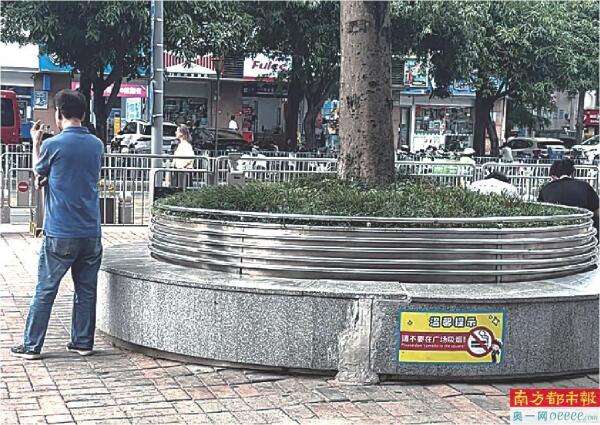 有人在花坛旁吸烟。花坛附近贴着禁烟标志。