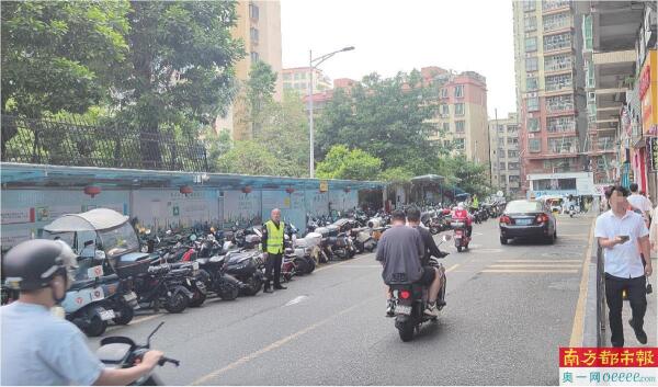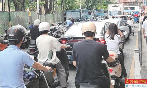 “五一”节后的工作日早高峰期间,南都·奥一新闻记者在龙岗区千欣街实地观察发现,道路靠小区围墙一侧搭建了电动自行车停车棚,7时30分许,双向两车道的千欣街已出现公交车、私家车与电动车混行拥堵,部分电动车还存在违规变道超车的情况,附近南芳学校门口的消防通道也有电动车违停。8时许,交警在道路最拥堵的学校出入口值守,但龙岗大道路口未见疏导人员。9时许,街道交安人员将违停在南芳学校门口的车辆转移至对面停车棚。但记者早高峰期间未见龙岗大道路口实际执行疏导措施。