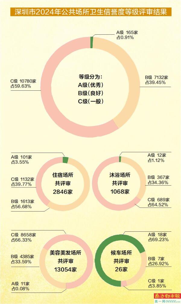 南都讯 深圳市卫生健康委员会日前正式发布《2024年全市公共场所(不含游泳场所)卫生信誉度等级评审结果通告》。此次评审覆盖住宿、沐浴、美容美发、候车、商场(书店)、文化娱乐等六大类共18077家公共场所。卫生信誉度等级分A(优秀)、B(良好)、C(一般)三个等级,其中A级共165家,占比0.91%,B级7132家占比39.45%,C级10780家占比59.63%。宝安汽车站、友谊书城、迪卡侬、华润万家、万达影城、深圳大剧院、七天酒店等场所(部分门店)因卫生信誉度一般被评为C级。