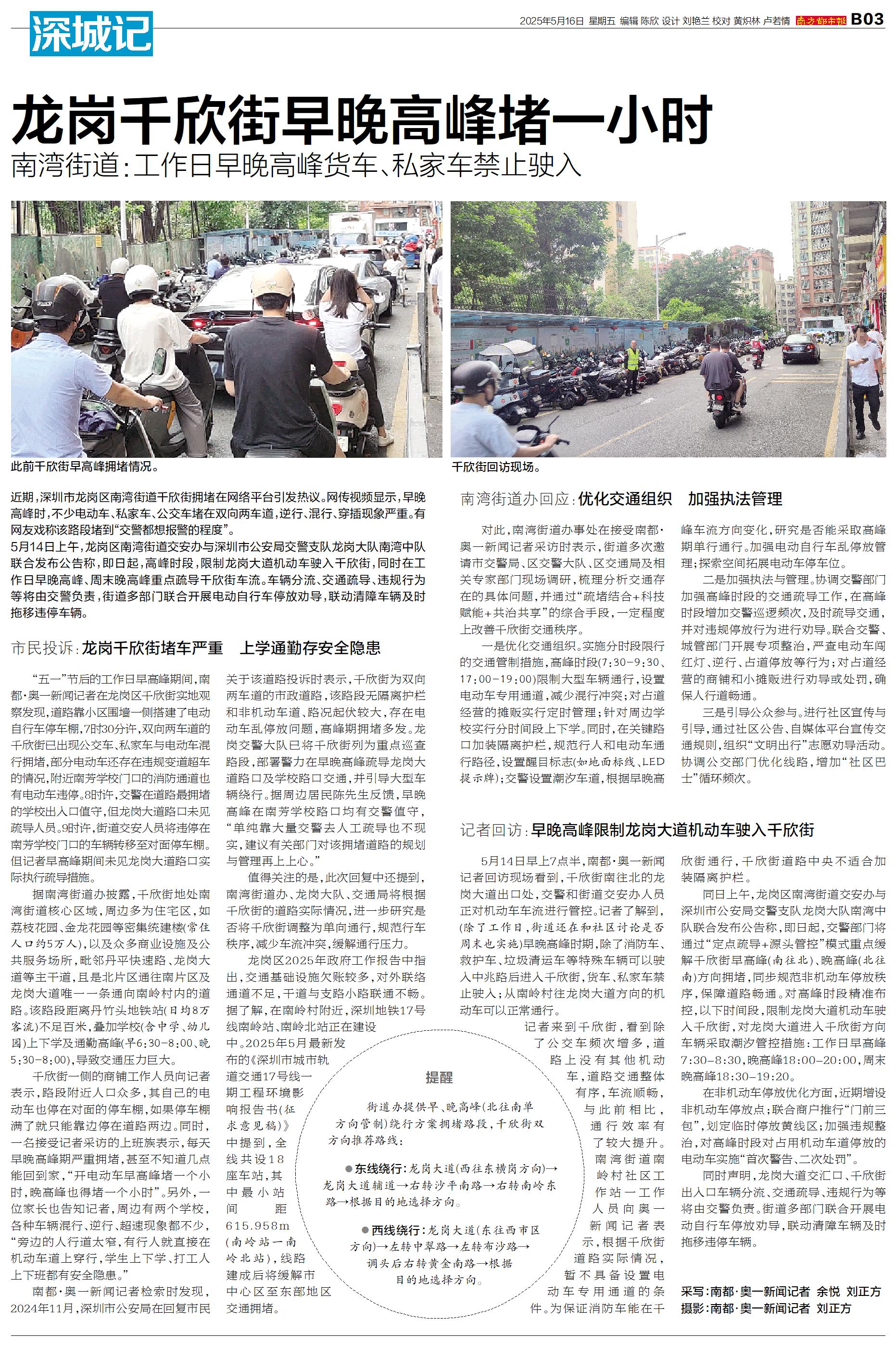 近期,深圳市龙岗区南湾街道千欣街拥堵在网络平台引发热议。网传视频显示,早晚高峰时,不少电动车、私家车、公交车堵在双向两车道,逆行、混行、穿插现象严重。有网友戏称该路段堵到“交警都想报警的程度”。