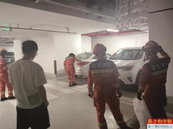 5月11日,消防员赶到龙华四海华亭小区,围绕车辆寻找眼镜蛇。