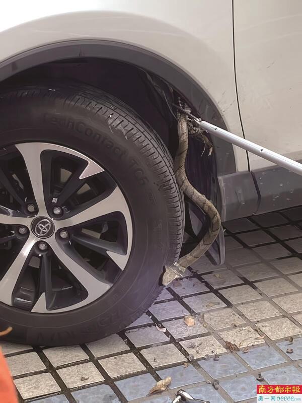 5月11日,龙华四海华亭小区车主把车开到修理厂,打开前盖发现眼镜蛇,消防员将其捕获。