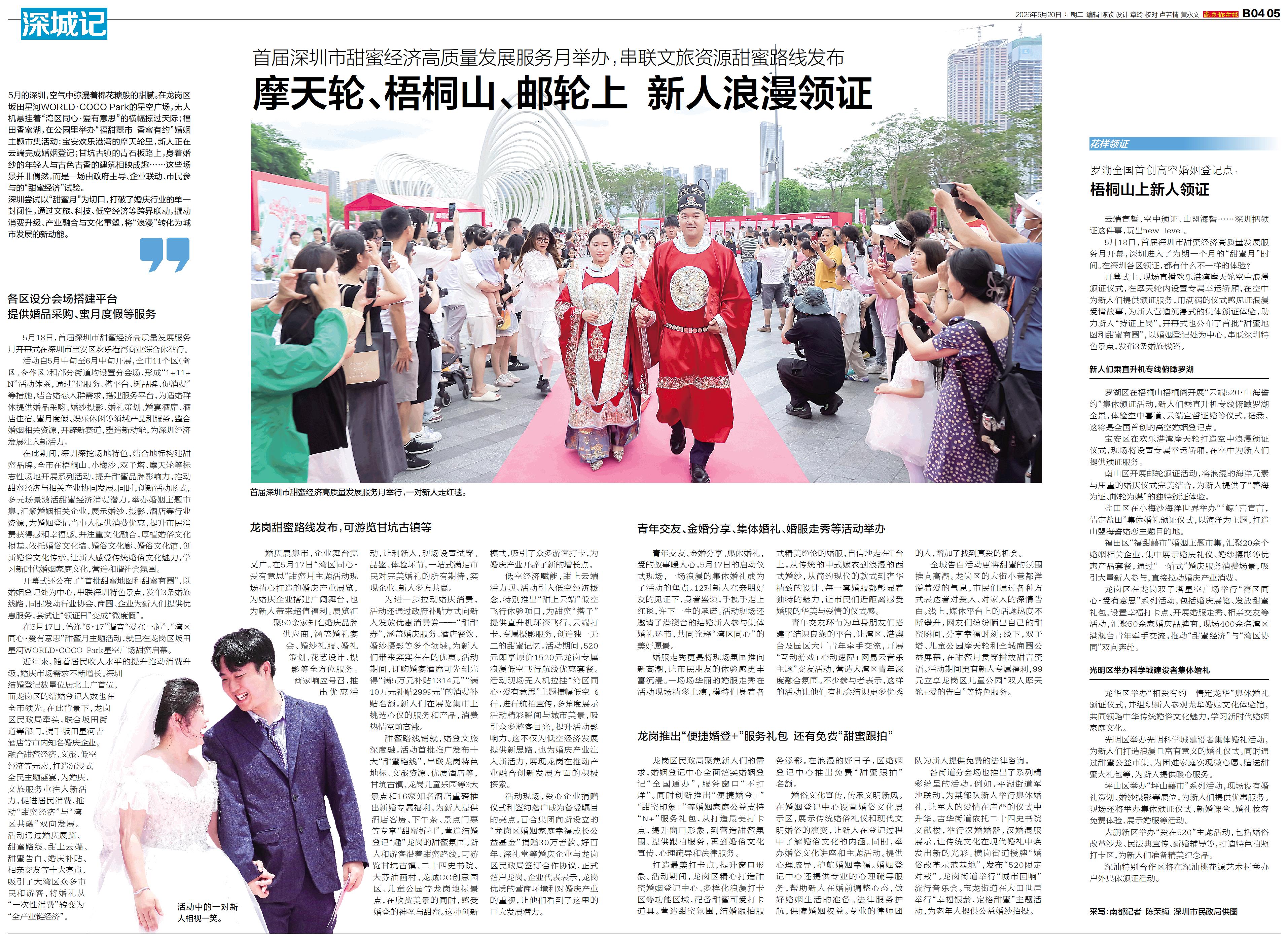 5月的深圳,空气中弥漫着棉花糖般的甜腻。在龙岗区坂田星河WORLD·COCO Park的星空广场,无人机悬挂着“湾区同心·爱有意思”的横幅掠过天际;福田香蜜湖,在公园里举办“福甜囍市 香蜜有约”婚