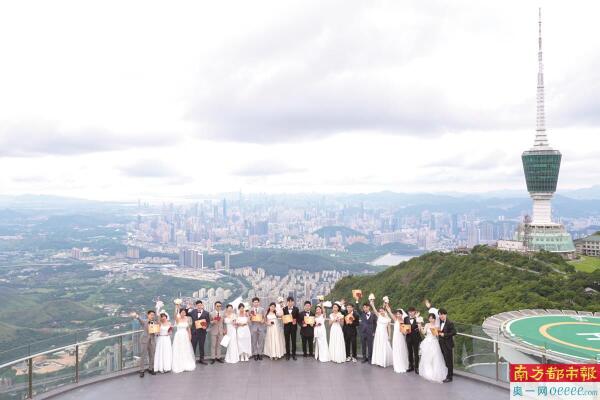10对新人从罗湖区婚姻登记中心完成材料登记注册后,从粤海置地大厦停机坪出发,搭乘直升机俯瞰鹏城美景,最后飞抵海拔694米的深圳新地标“梧桐阁”体验空中喜道、云端宣誓证婚等仪式。5月20日,罗湖区开展“云端520·山海誓约”浪漫活动,设立全市首个高空婚礼颁证点,通过“高空婚姻颁证+场景化体验+产业联动”模式,打造深圳婚恋文旅新名片——梧桐阁“深圳爱情新地标”。