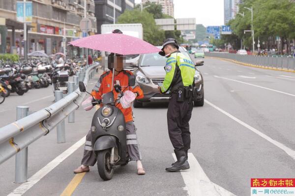 工作人员针对电动自行车驾驶人不戴头盔、无牌上路、非法改装等行为进行整治。 南都记者 覃仕林 摄