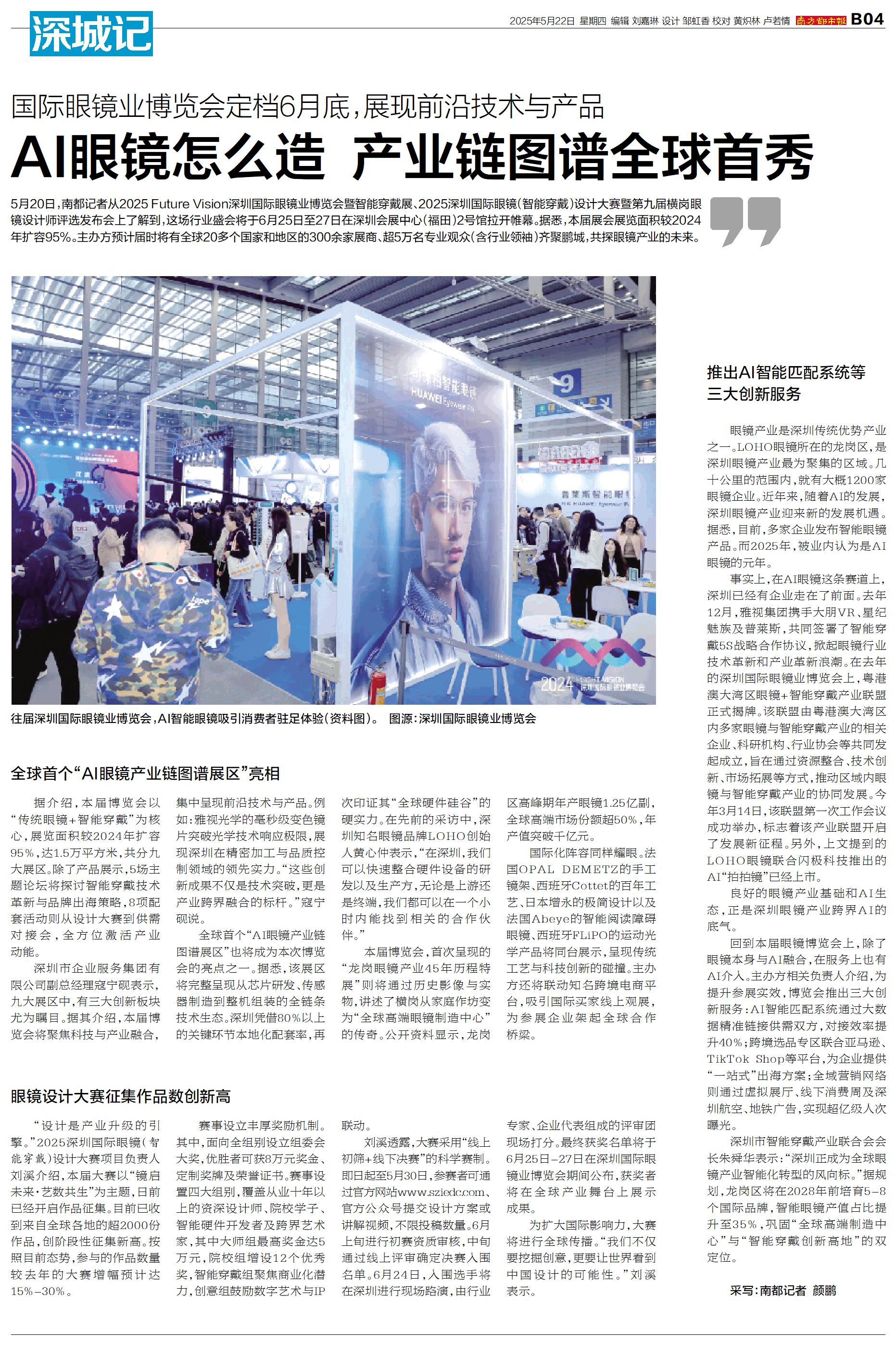 5月20日,南都记者从2025 Future Vision深圳国际眼镜业博览会暨智能穿戴展、2025深圳国际眼镜(智能穿戴)设计大赛暨第九届横岗眼镜设计师评选发布会上了解到,这场行业盛会将于6月2