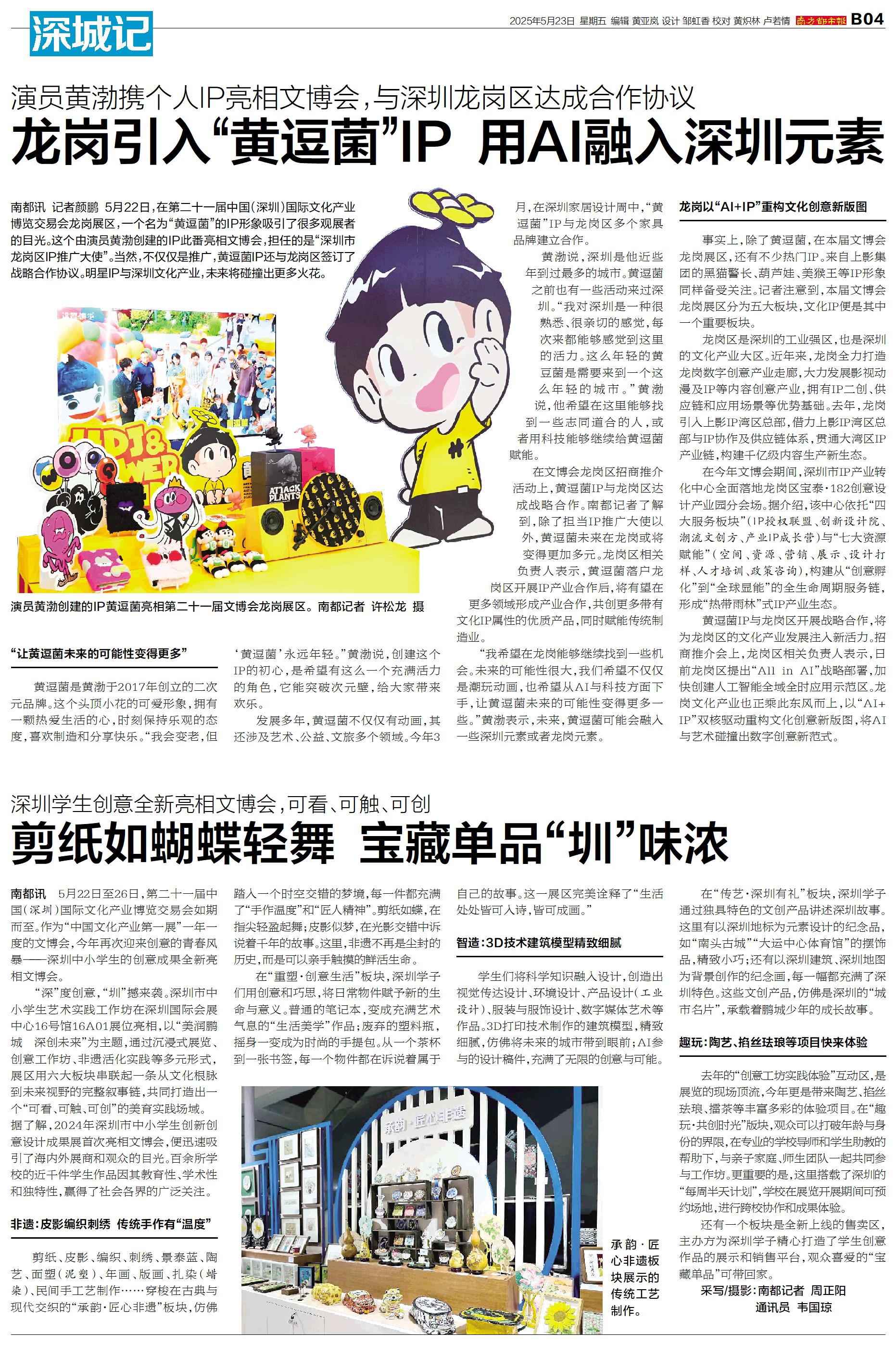 南都讯 记者颜鹏 5月22日,在第二十一届中国(深圳)国际文化产业博览交易会龙岗展区,一个名为“黄逗菌”的IP形象吸引了很多观展者的目光。这个由演员黄渤创建的IP此番亮相文博会,担任的是“深圳市龙