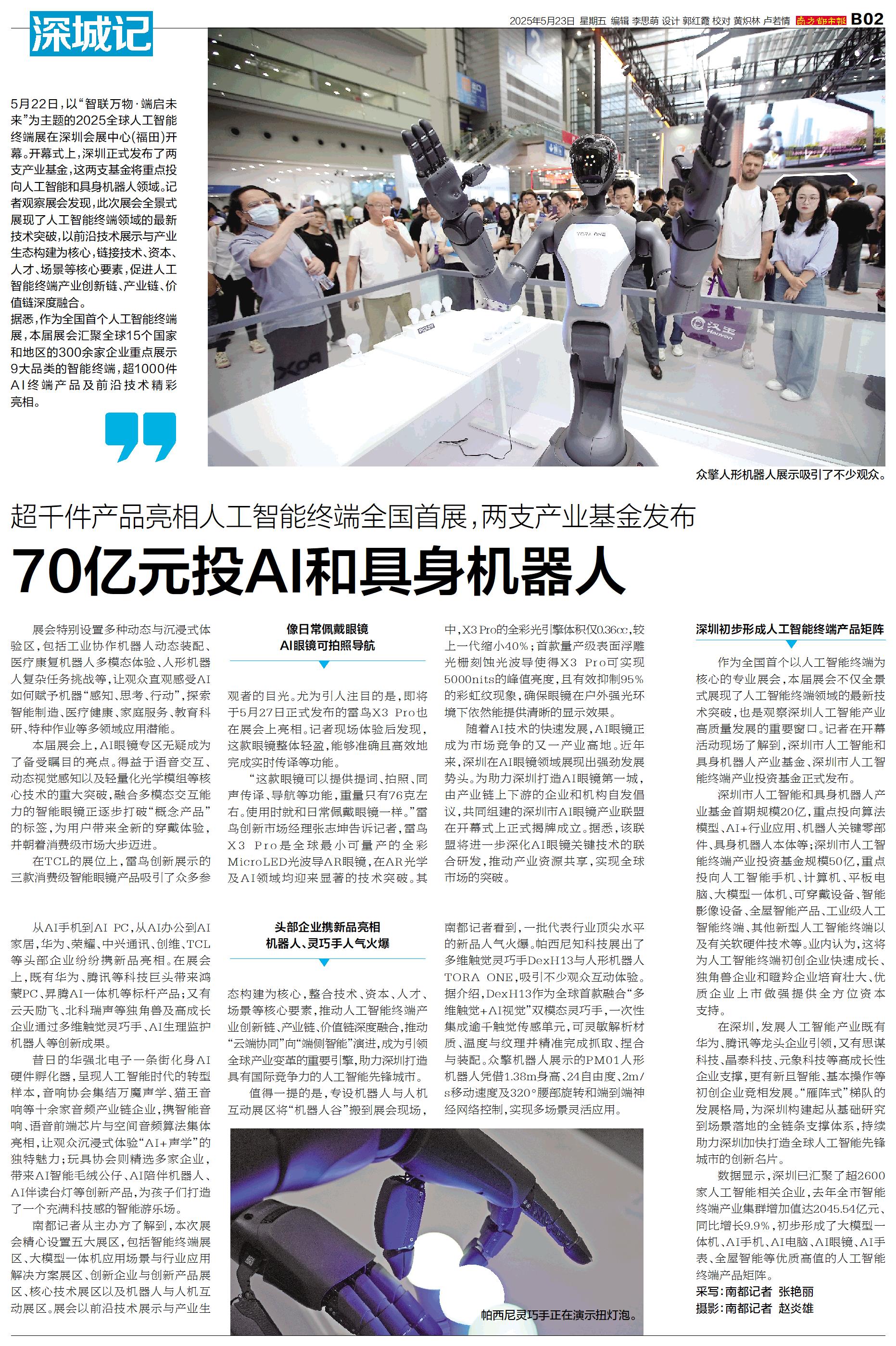 5月22日,以“智联万物·端启未来”为主题的2025全球人工智能终端展在深圳会展中心(福田)开幕。开幕式上,深圳正式发布了两支产业基金,这两支基金将重点投向人工智能和具身机器人领域。记者观察展会发